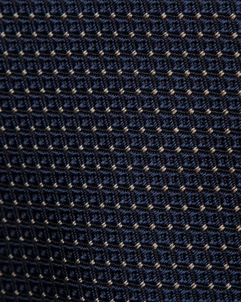 Questo modello si fonda su una base Blu Navy istituzionale, lavorata con una tecnica jacquard che crea una trama a rombi tonali. La geometria del rombo, realizzata con un’inversione della tessitura, genera un effetto opaco-lucido che movimenta il fondo senza ricorrere a contrasti cromatici netti. A completare il design intervengono delicati puntini avorio, posizionati con precisione millimetrica, che illuminano la cravatta come piccole perle incastonate.