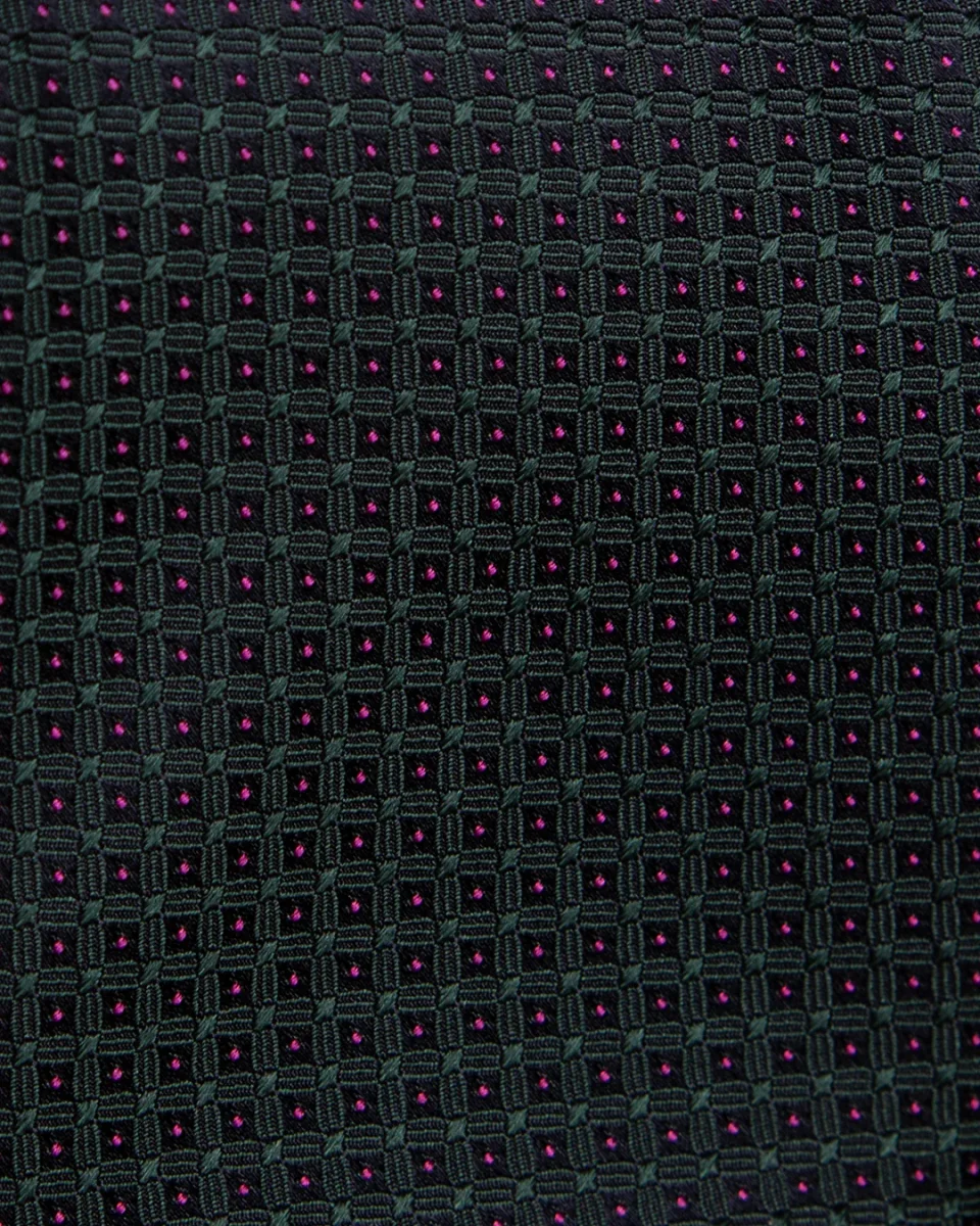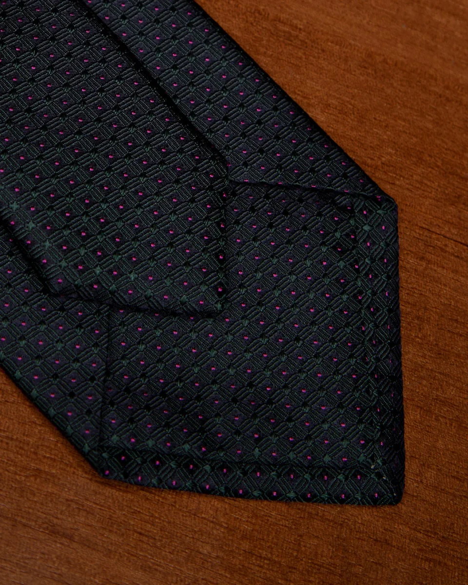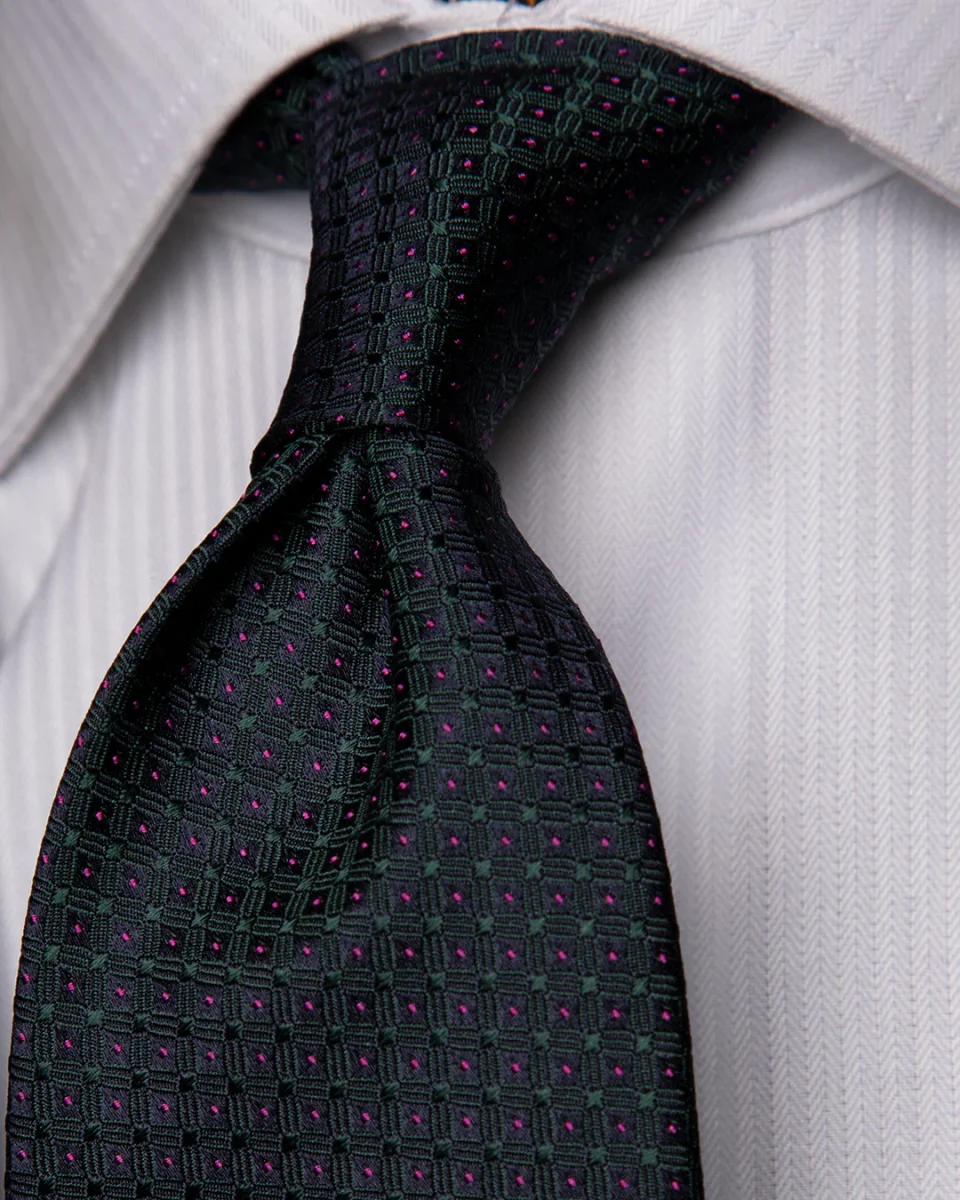 Questa cravatta eleva il concetto di geometria sartoriale attraverso un triplo strato visivo. La base Blu Notte funge da tela profonda per una sottile griglia Verde Bosco, un colore che richiama l’eleganza naturale e il gusto country-gentleman. A rompere la severità dei toni scuri intervengono i puntini Magenta, che agiscono come accenti cromatici vibranti, donando alla cravatta una modernità inaspettata e una luminosità magnetica.