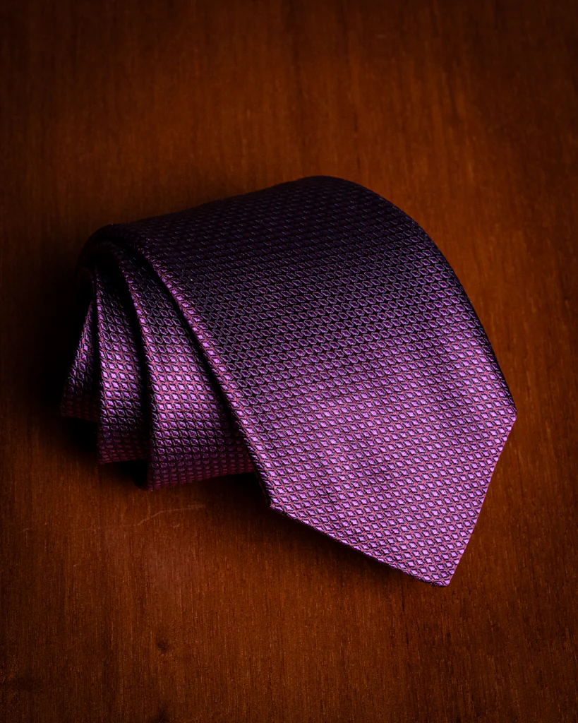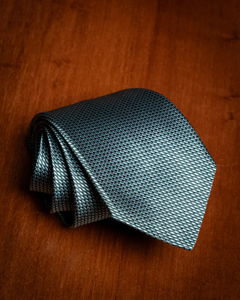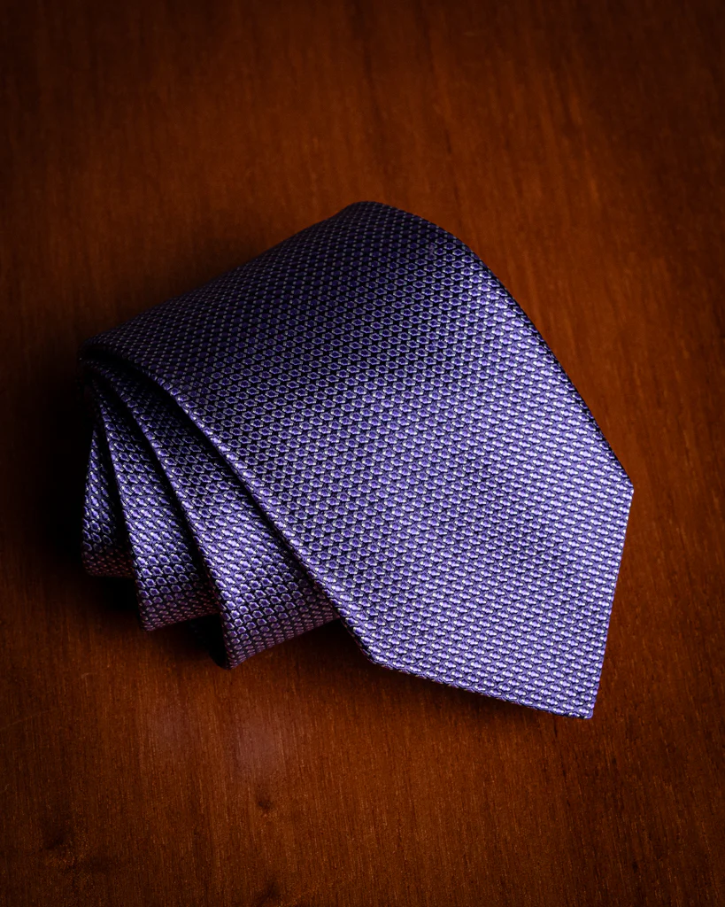 Questo modello sfrutta la precisione del telaio jacquard per creare un pattern ripetuto e armonioso. La combinazione tra il colore della base e quello della trama ellittica genera un’iridescenza discreta, rendendo la cravatta dinamica e capace di reagire in modo unico alla luce naturale e artificiale.