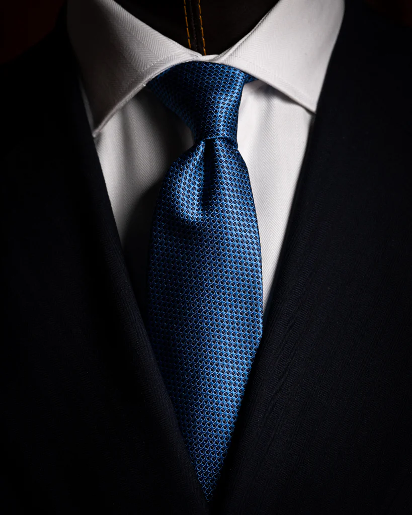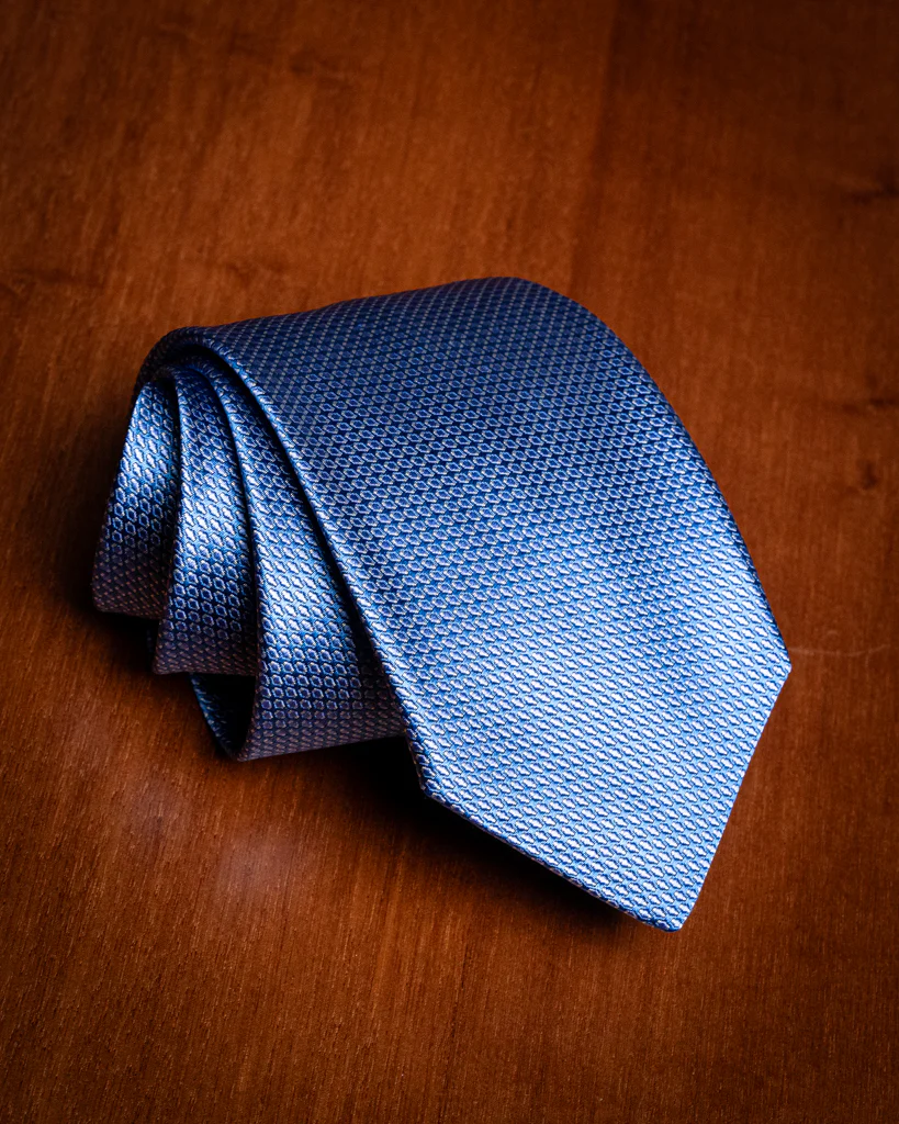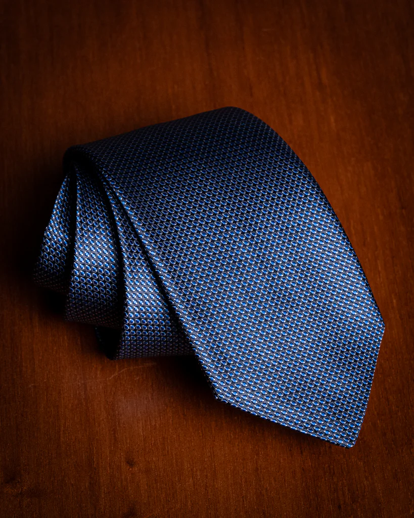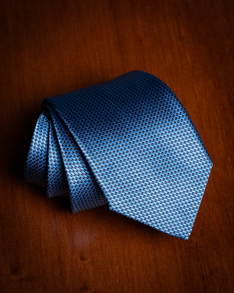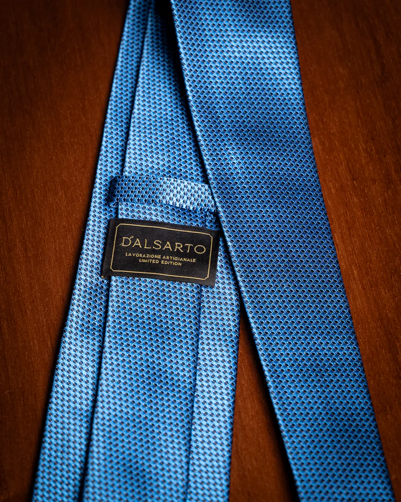 - Blu Cobalto con Microtrama Azzurra: Una variante luminosa e fresca; l’azzurro agisce come punto luce, rendendo la cravatta ideale per contesti business diurni.