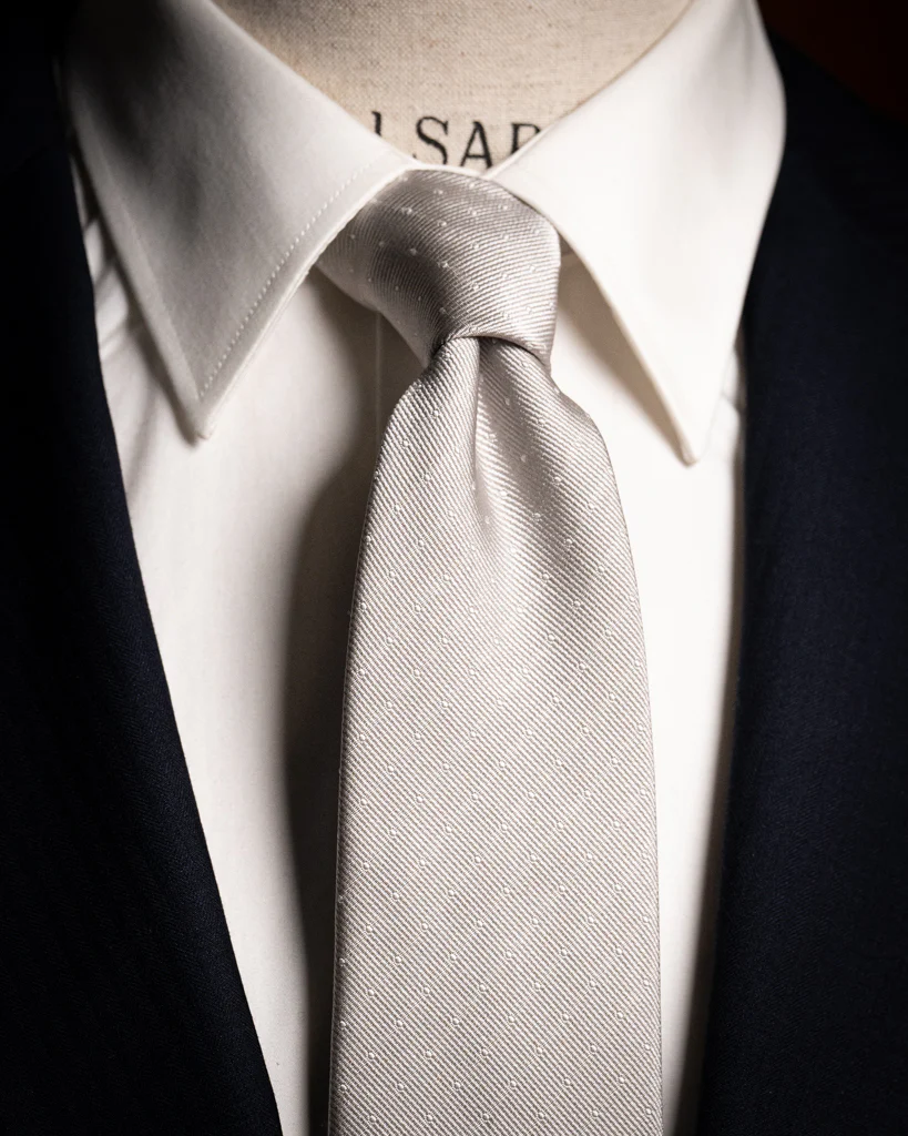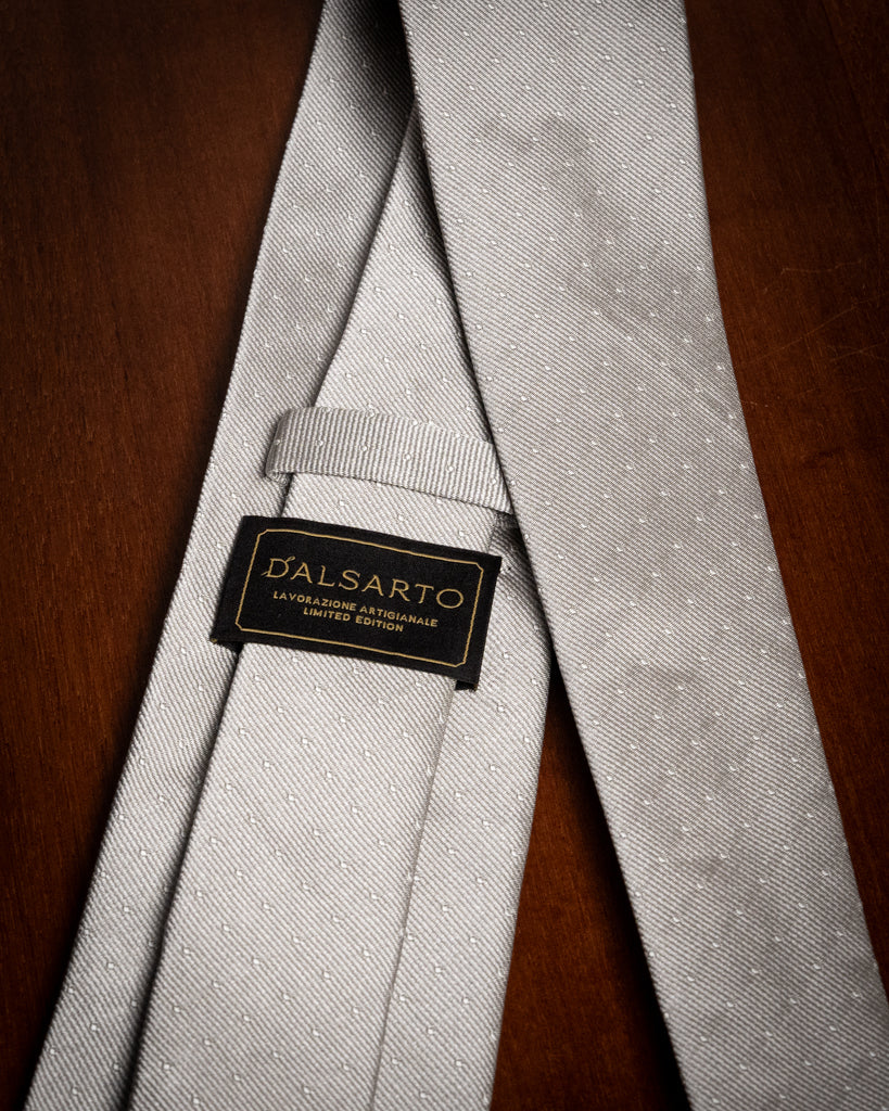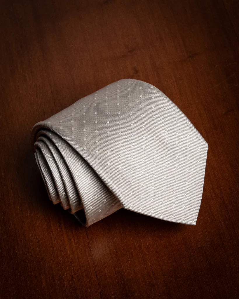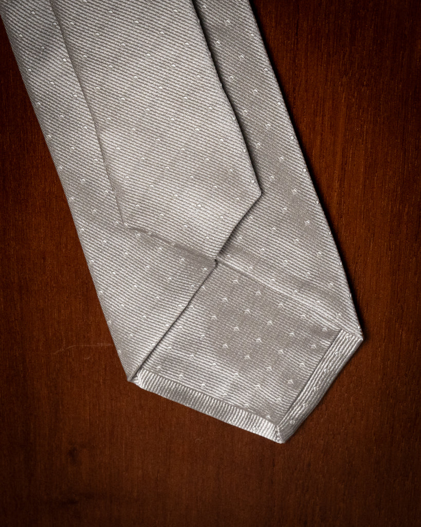 Questo accessorio si distingue per la base Grigio Perla, una tonalità argentea e sofisticata che cattura la luce in modo naturale. Il pois bianco non è stampato, ma è il risultato di un’accurata lavorazione jacquard: ogni puntino è tessuto direttamente nella trama della seta, emergendo leggermente dalla superficie per donare una tridimensionalità materica che le versioni stampate non possono offrire.