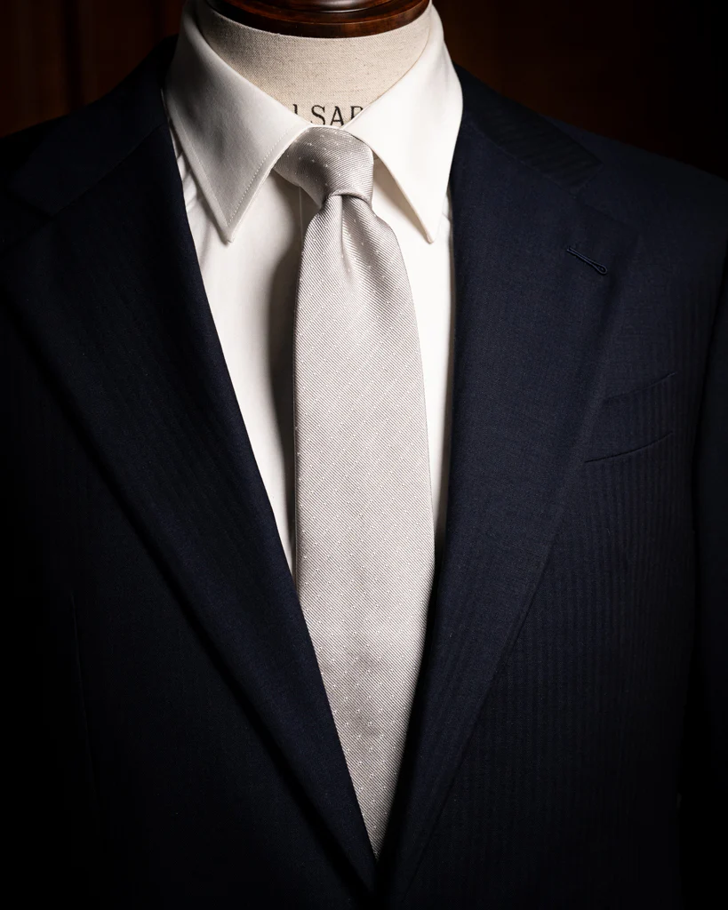 - Trama: Micro-disegno a puntini bianchi su armatura jacquard. La precisione millimetrica del telaio assicura una simmetria perfetta del pattern su tutta la lunghezza.