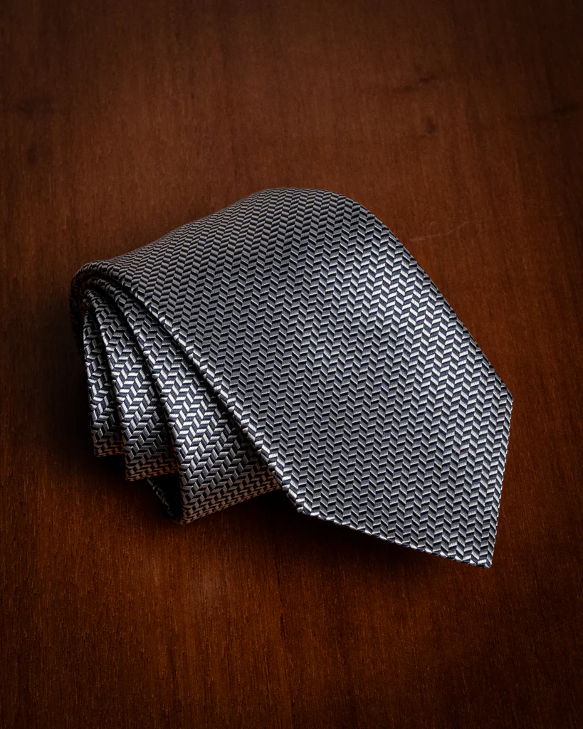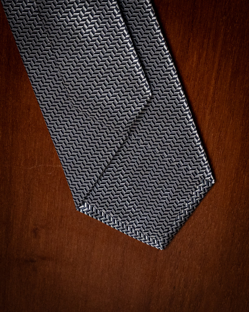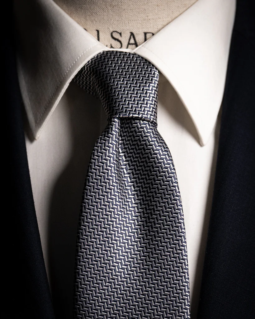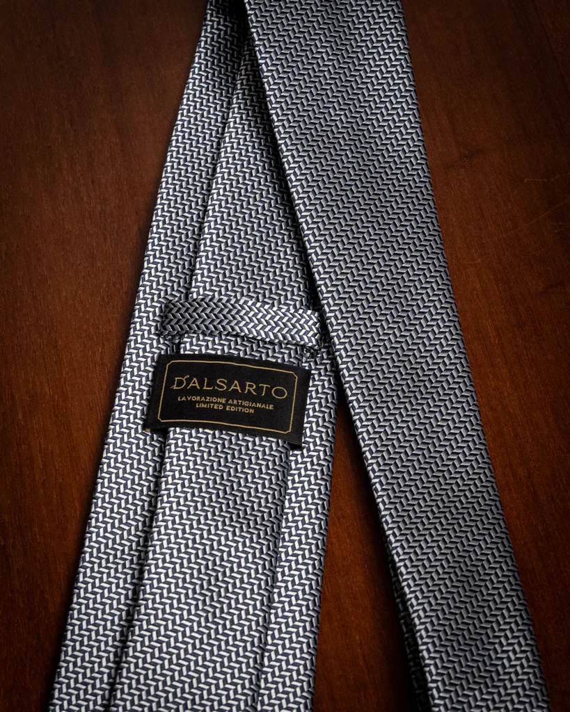 Questo accessorio si basa su una struttura Spinata , ottenuta attraverso un complesso intreccio di filati blu notte e bianchi. La tecnica jacquard permette di alternare l’orientamento delle fibre, creando un effetto a zig-zag millimetrico che dona alla seta una texture materica e una tridimensionalità unica. Da lontano, la cravatta appare come un blu medio luminoso e mosso; da vicino, rivela tutta la precisione del suo disegno geometrico.