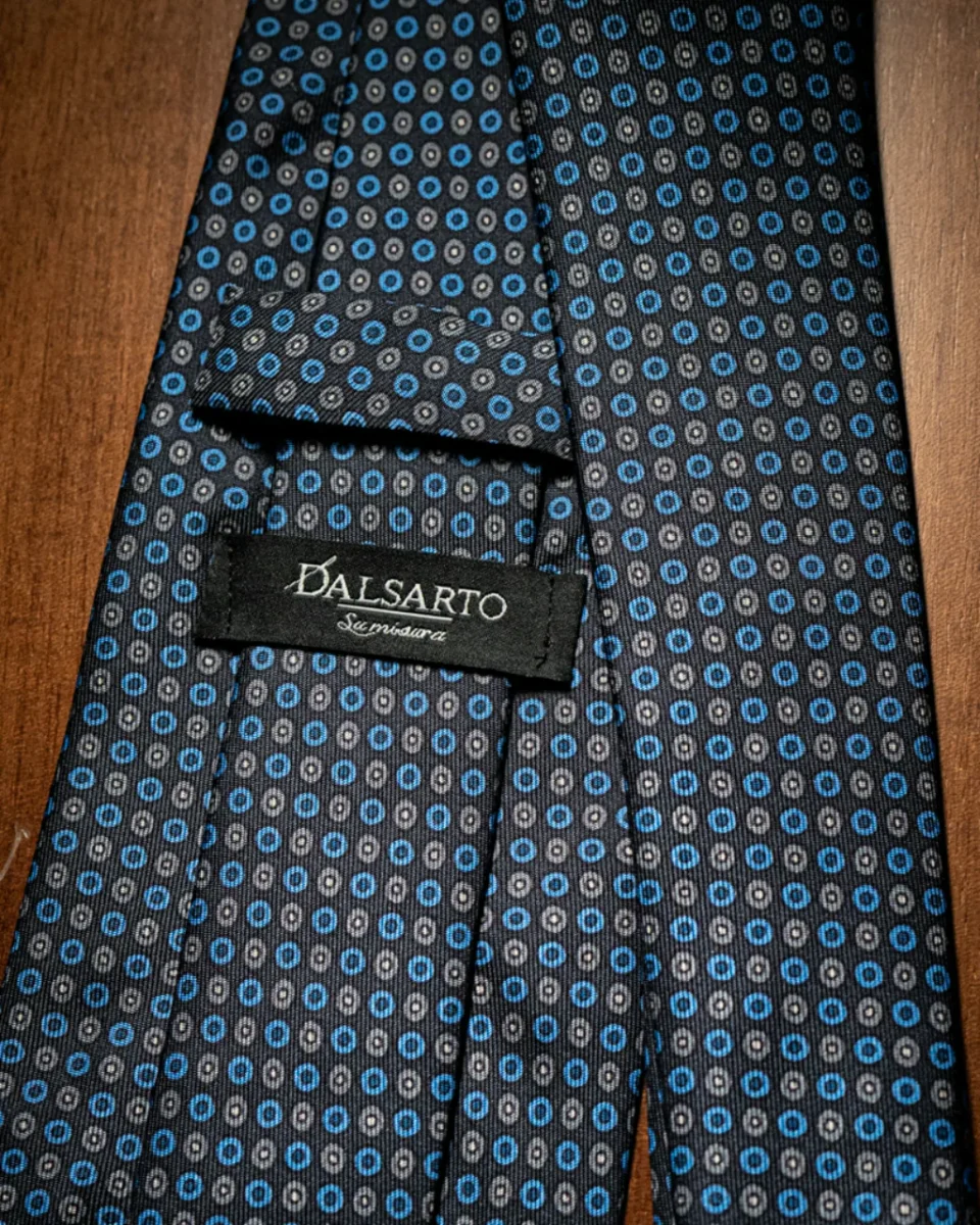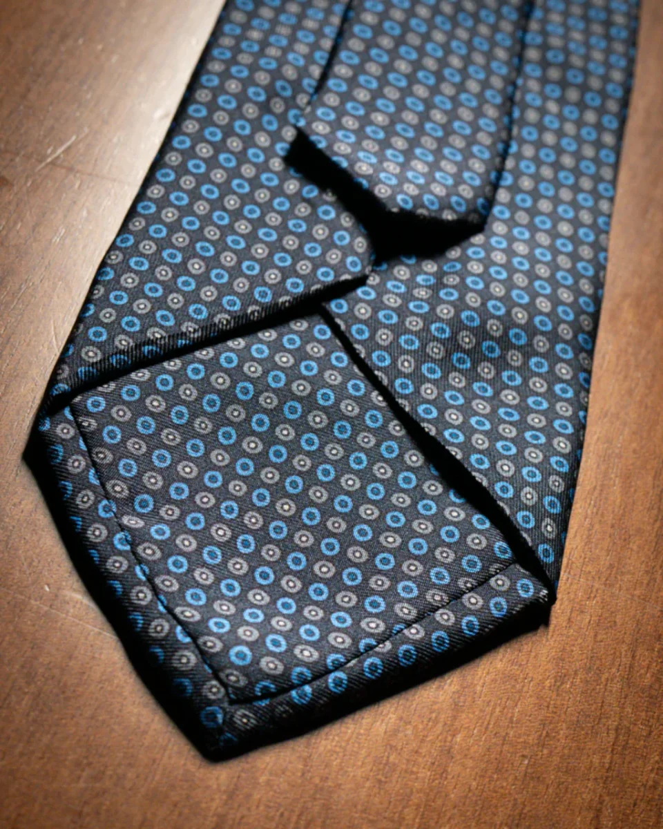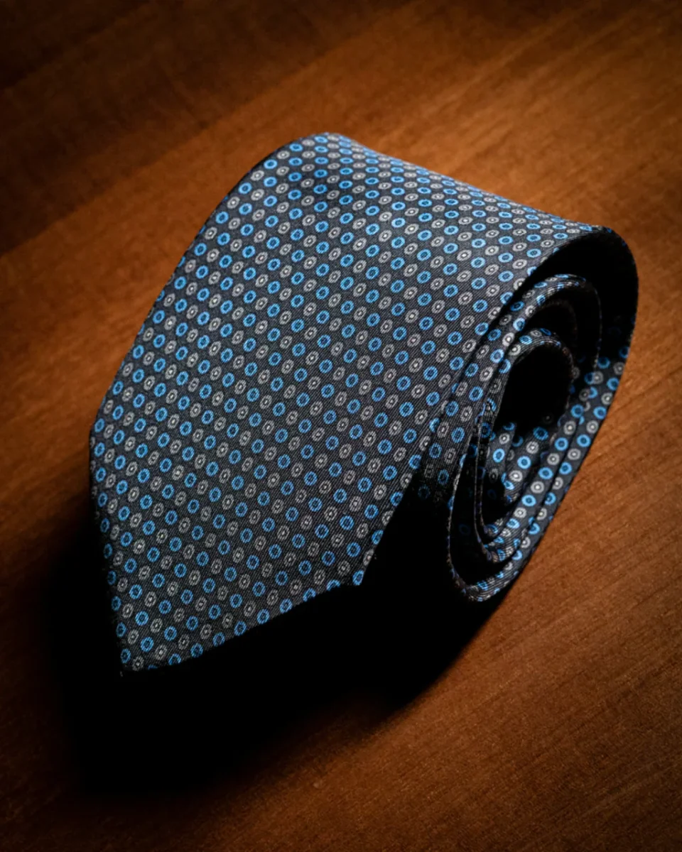 - Design Distinto: La trama marrone arricchita da eleganti tondi blu crea un effetto visivo unico, conferendo alla cravatta un tocco di originalità.