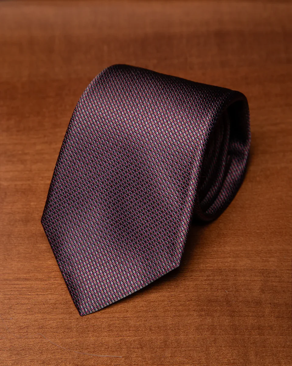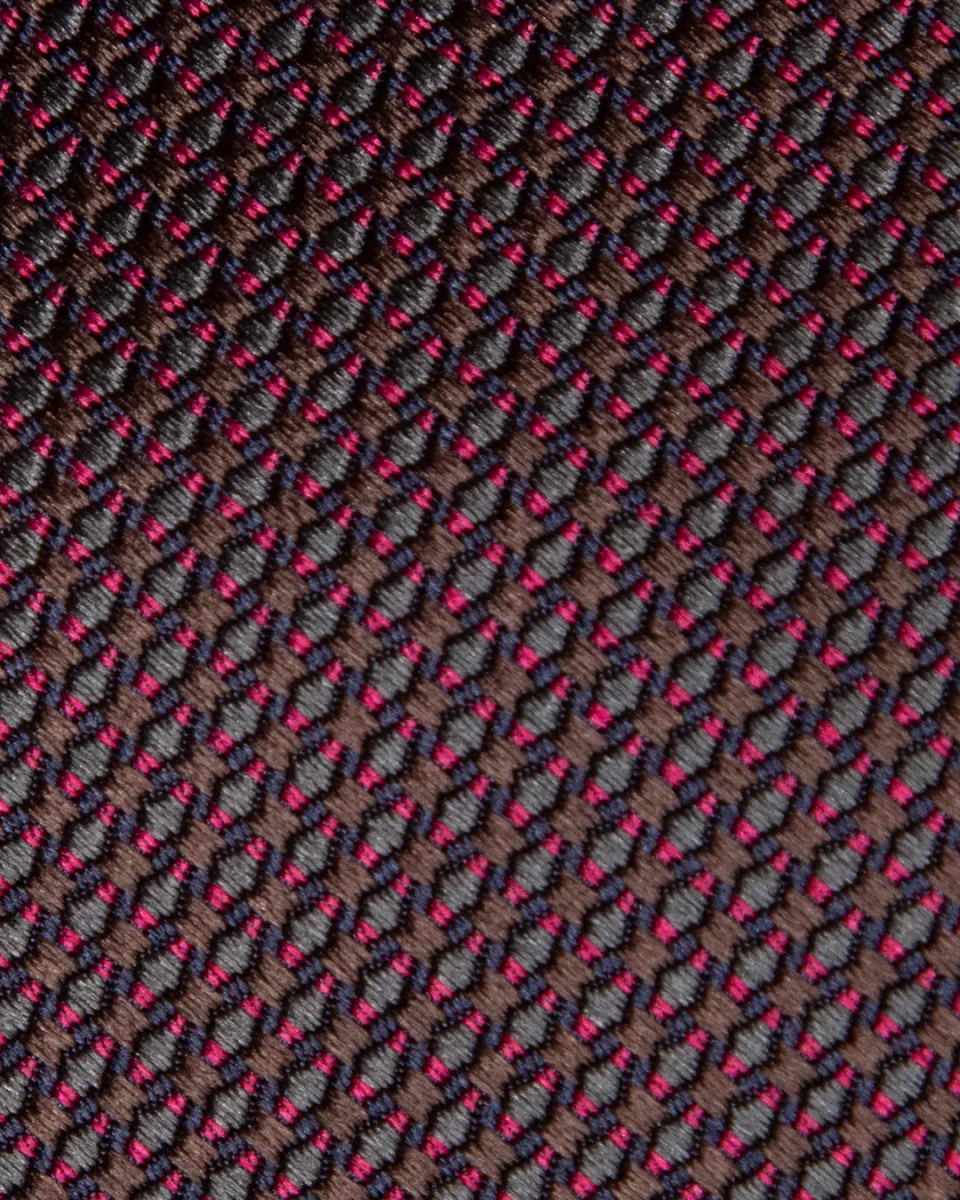 Il fascino di questo modello risiede nell’armatura bicolore che fonde una base marrone cioccolato con una fitta trama di micro-punti rosso rubino. La lavorazione jacquard crea un effetto ottico “testurizzato”: la cravatta appare sobria e scura in ombra, ma rivela bagliori ambrati e caldi non appena viene colpita dalla luce naturale.