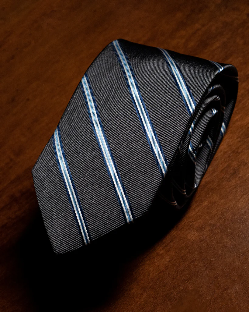 Questo modello poggia su una base Marrone Testa di Moro o Cioccolato, densa e rassicurante, solcata da decise bande diagonali a contrasto in Azzurro Polvere, Crema o Bronzo. La lavorazione jacquard trasforma la classica riga in un elemento materico: le bande non sono stampate, ma tessute con armature differenti che creano un alternarsi di riflessi satinati e superfici più opache. È la cravatta perfetta per chi vuole trasmettere un’autorità meno distaccata del blu, preferendo un’eleganza che parla di tradizione e comfort sartoriale.