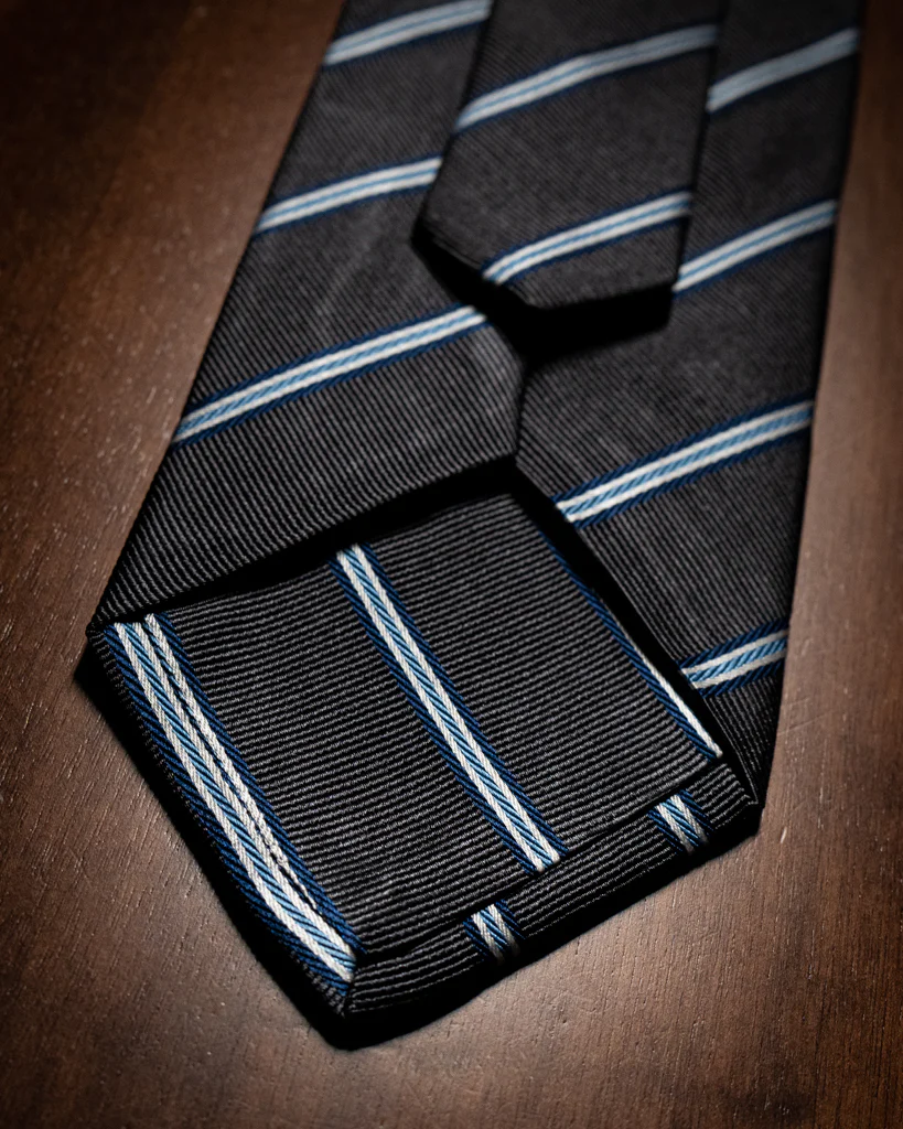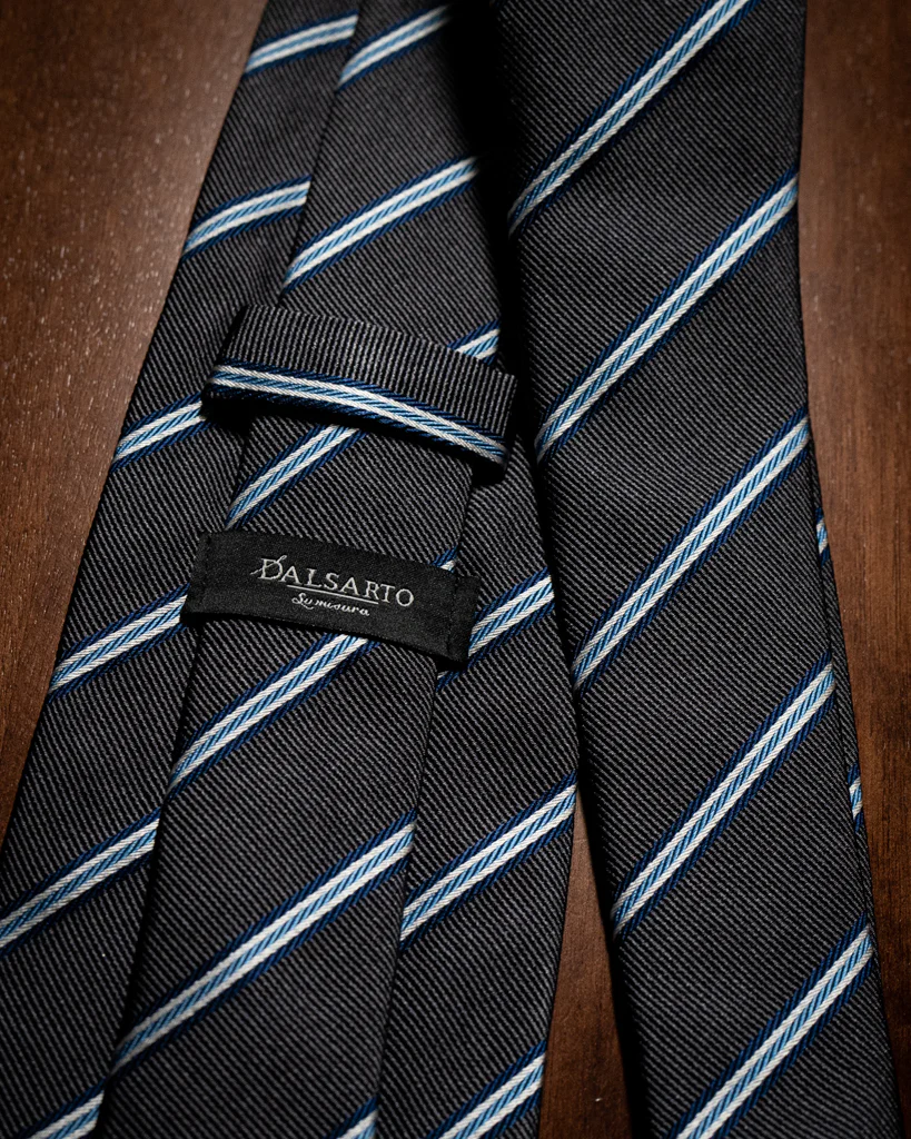 - Tessitura: Rigato obliquo a passo alternato. La precisione del telaio jacquard garantisce una simmetria perfetta delle bande lungo tutta la pala, fondamentale per l’ordine visivo del petto.