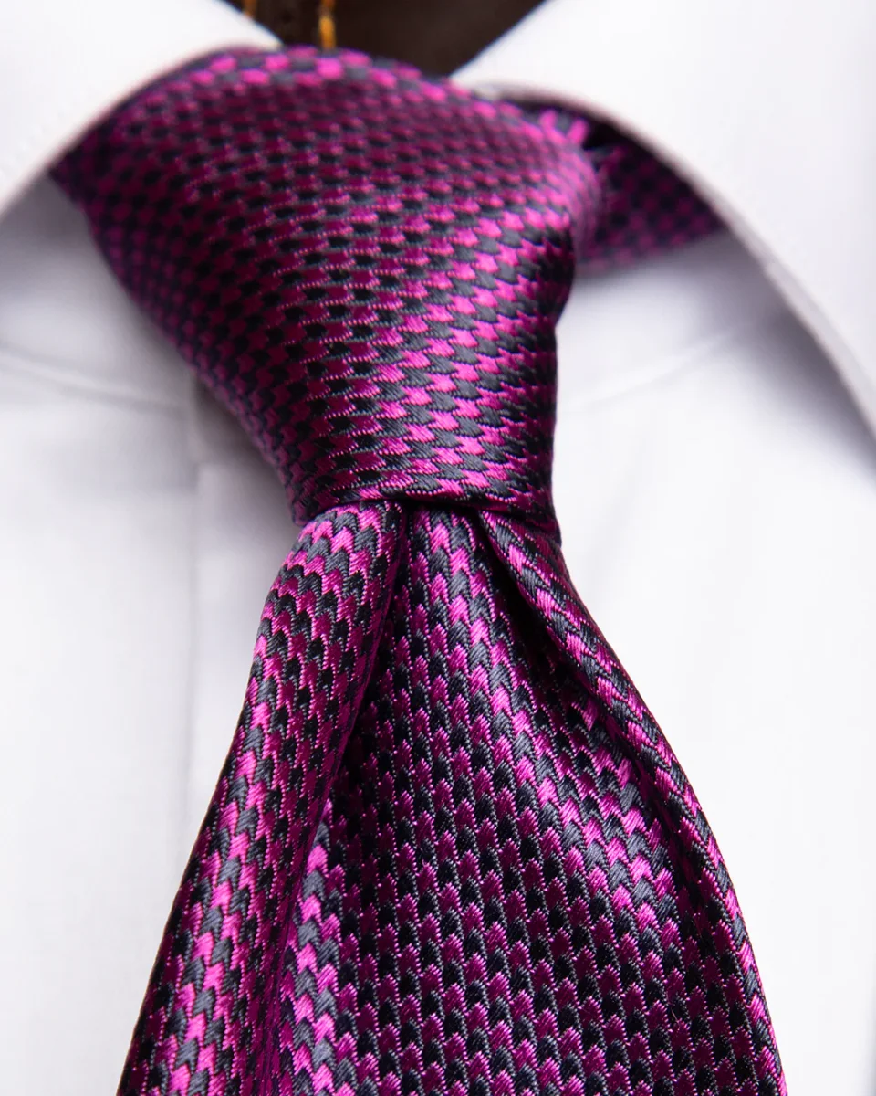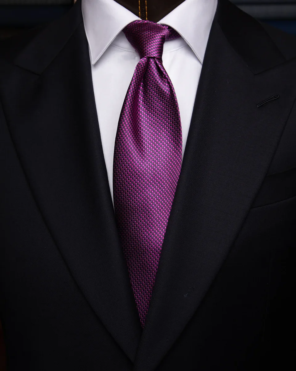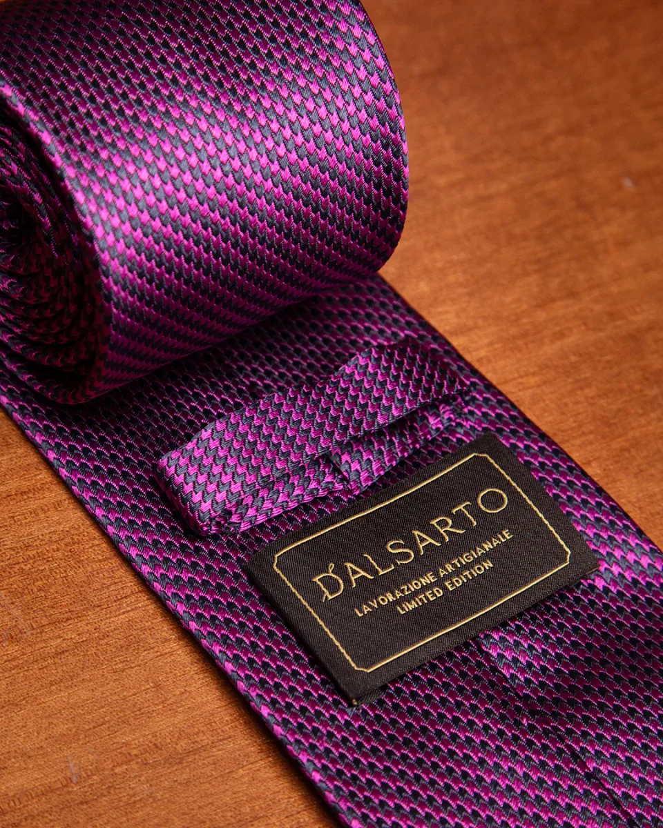 - Luminosità: La seta viola riflette la luce con sfumature cangianti, offrendo una brillantezza sofisticata che esalta il nodo e la caduta della cravatta.