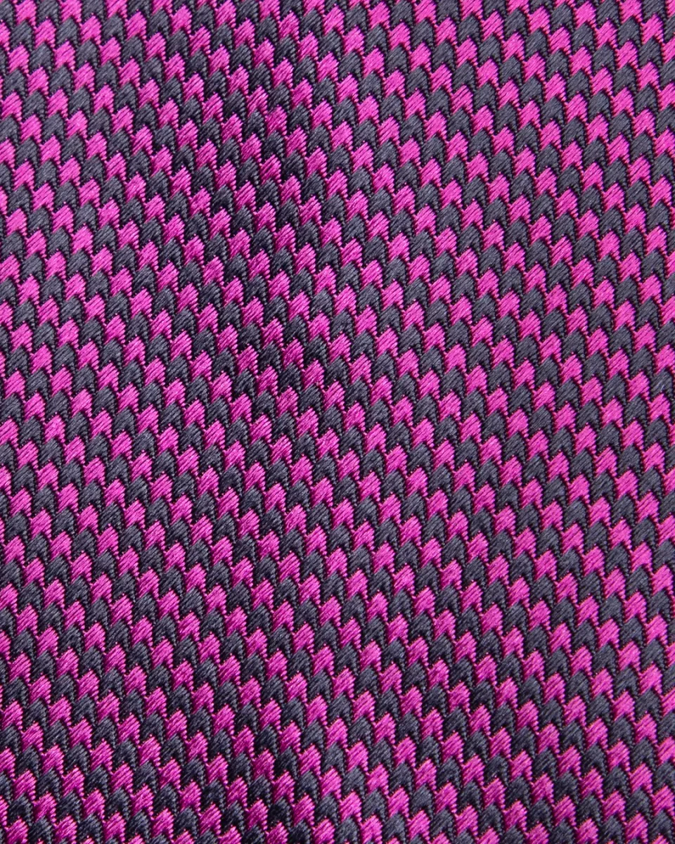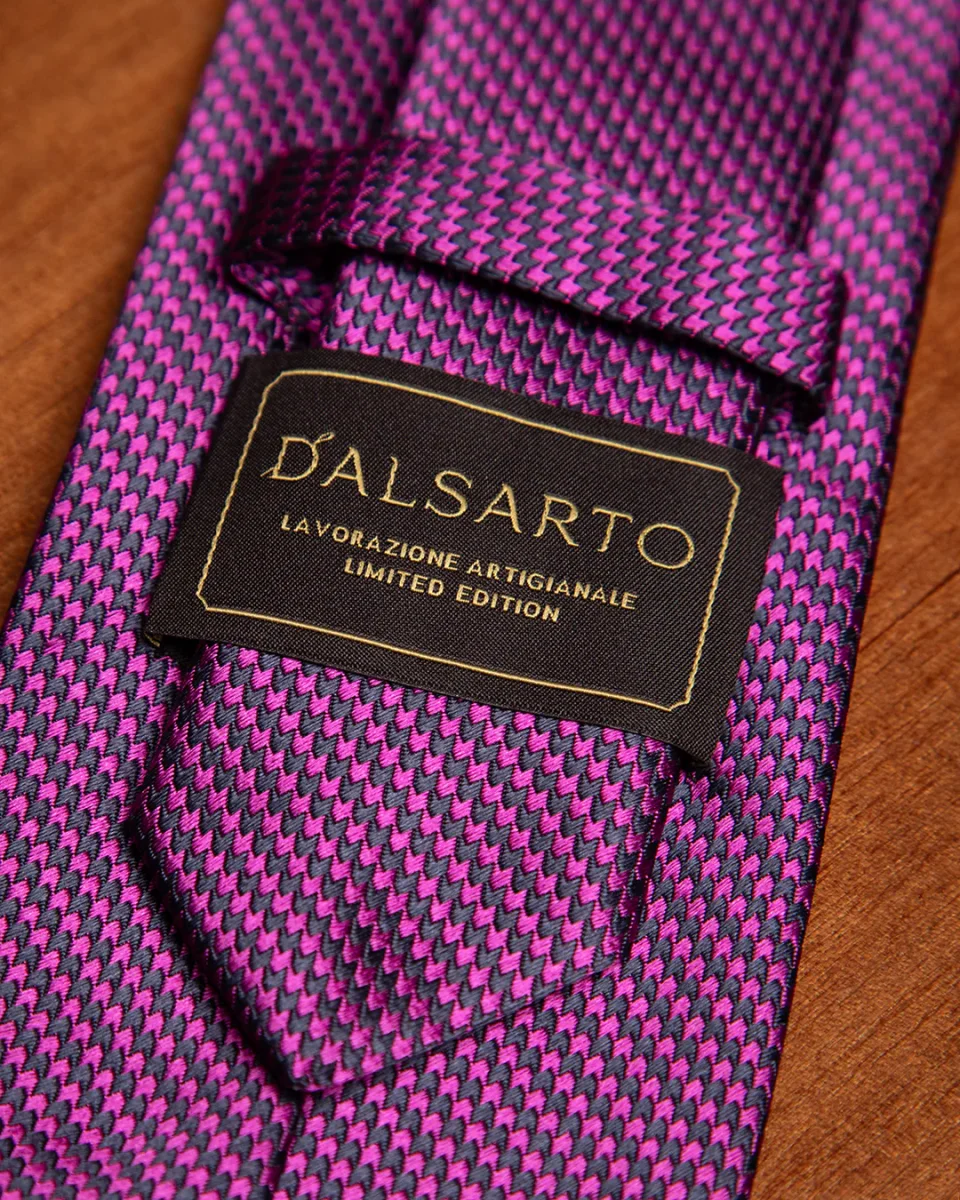 Questa cravatta si distingue per la sua base cromatica intensa, che spazia dal viola prugna al melanzana, arricchita da una micro-geometria jacquard. Il pattern estremamente ridotto crea un effetto ottico di colore pieno se visto a distanza, rivelando solo a uno sguardo ravvicinato la complessità dell’intreccio e la sua preziosa texture.