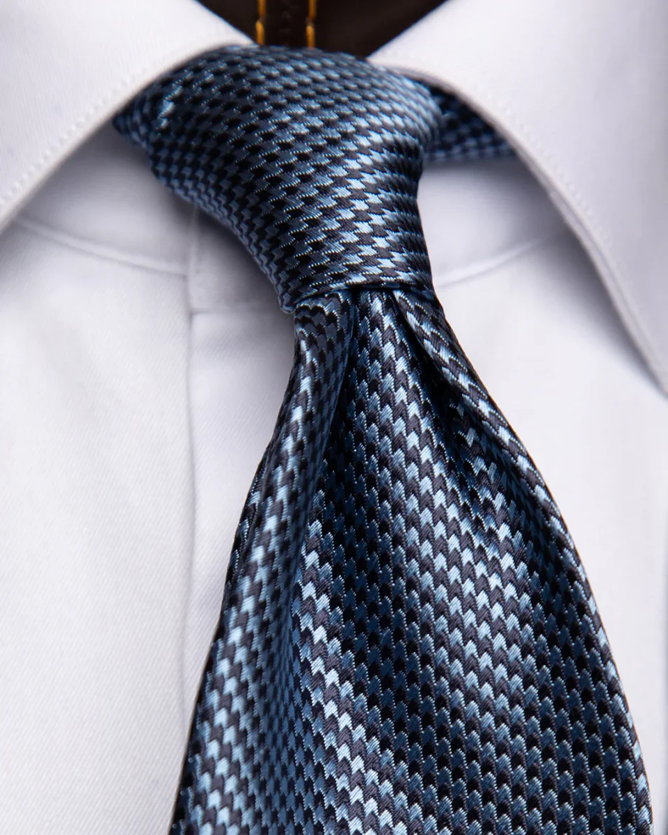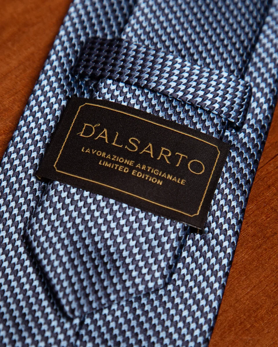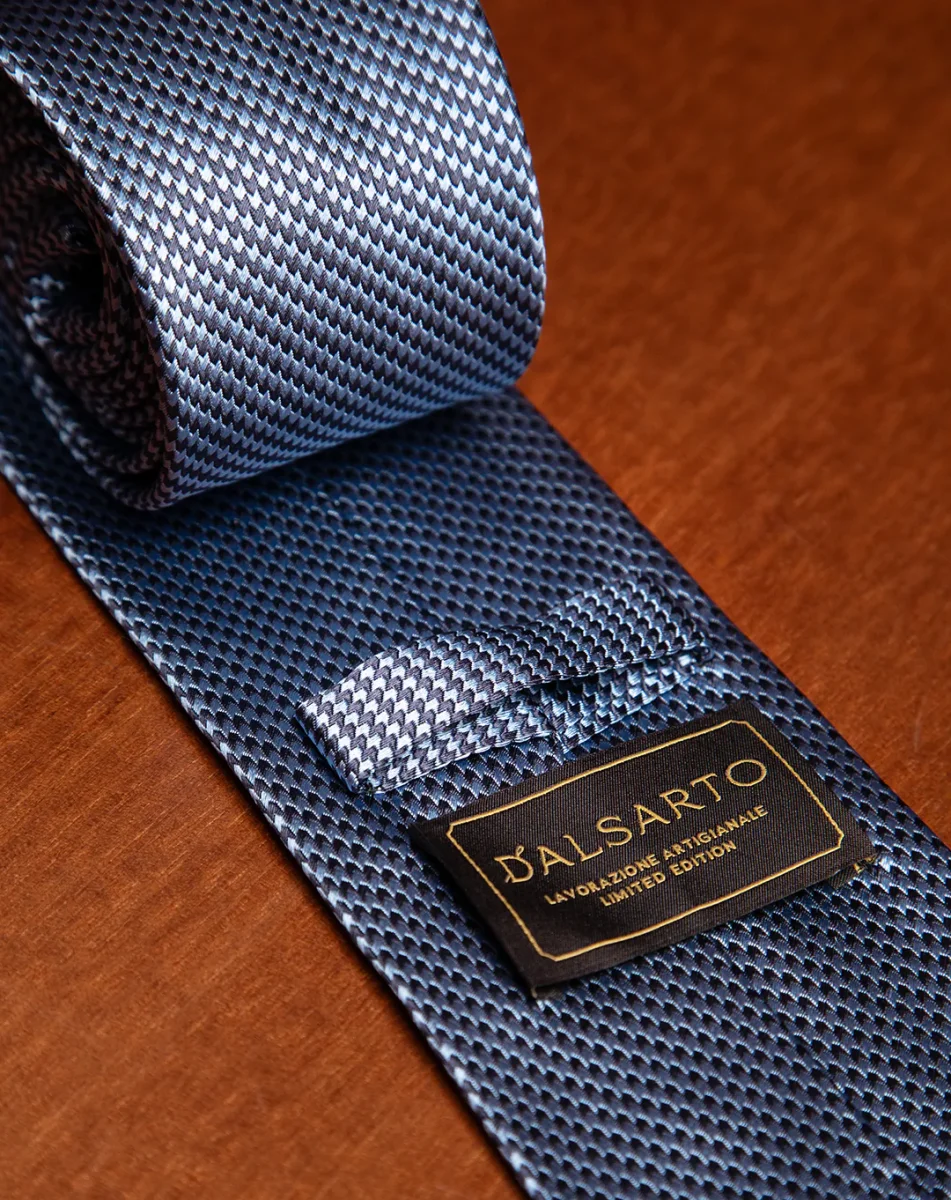 Il fascino di questo modello risiede nella sua micro-armatura: un intreccio serrato di filati blu notte e azzurro cielo che crea un effetto ottico di colore “mosso”. Da lontano, la cravatta appare come un blu polveroso e profondo; da vicino, rivela una texture vibrante che cattura la luce in modo non uniforme, conferendo al nodo una tridimensionalità superiore rispetto alle sete lisce.