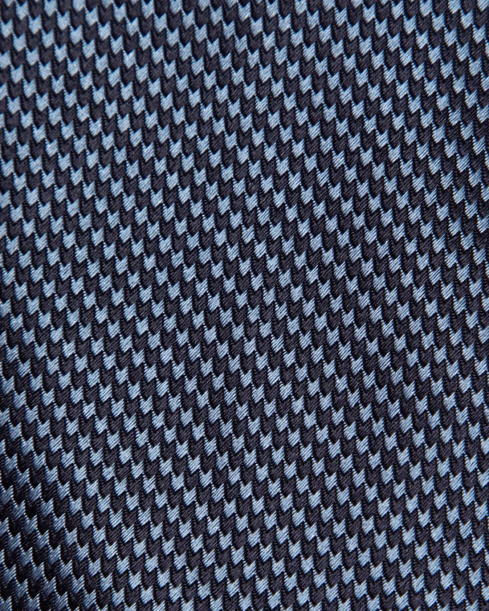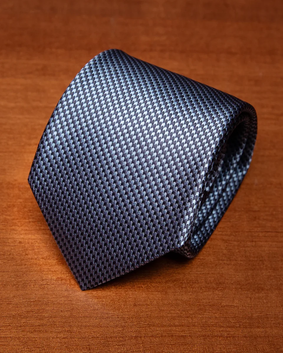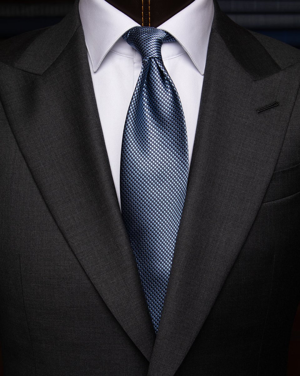 Il fascino di questo modello risiede nella sua micro-armatura: un intreccio serrato di filati blu notte e azzurro cielo che crea un effetto ottico di colore “mosso”. Da lontano, la cravatta appare come un blu polveroso e profondo; da vicino, rivela una texture vibrante che cattura la luce in modo non uniforme, conferendo al nodo una tridimensionalità superiore rispetto alle sete lisce.