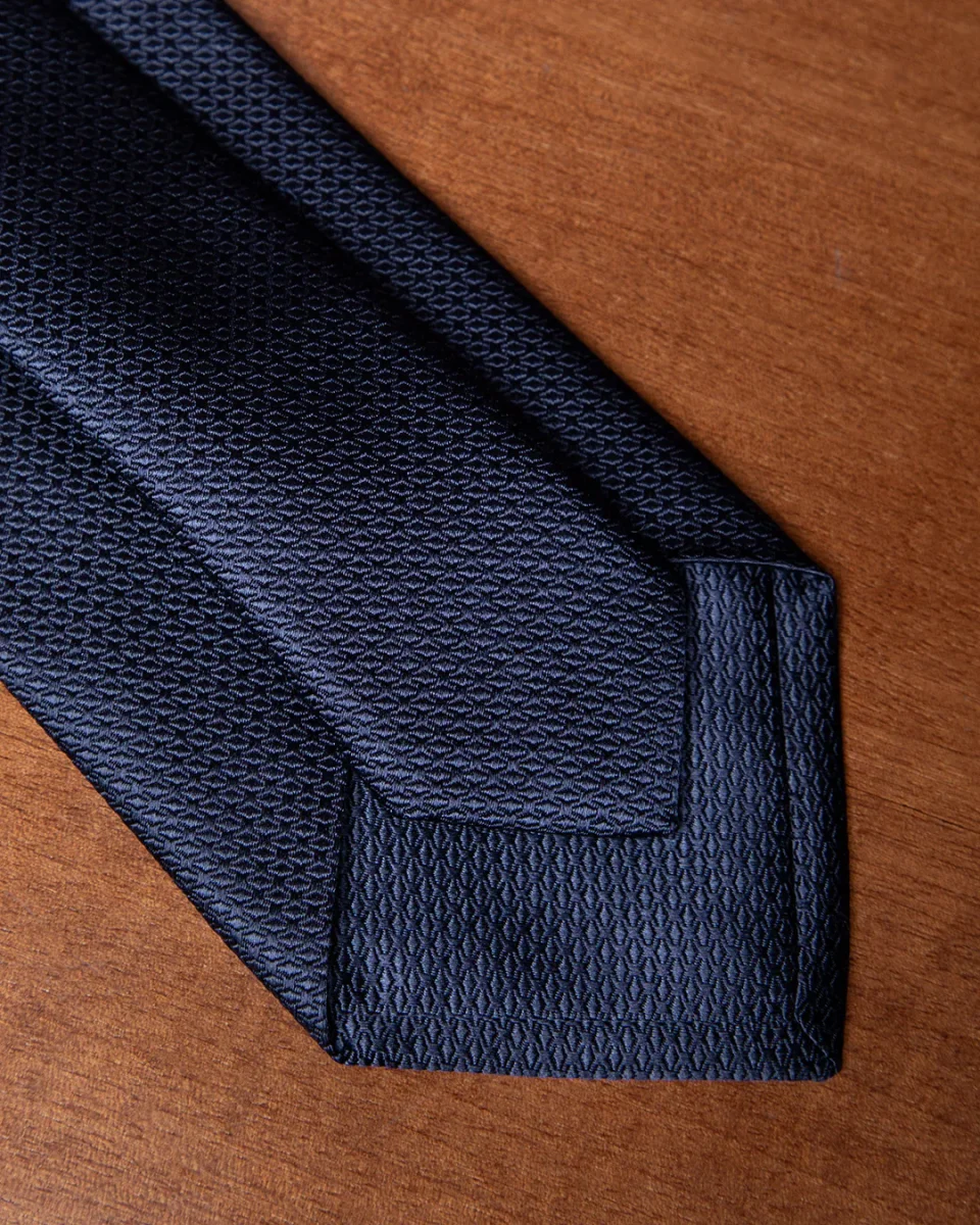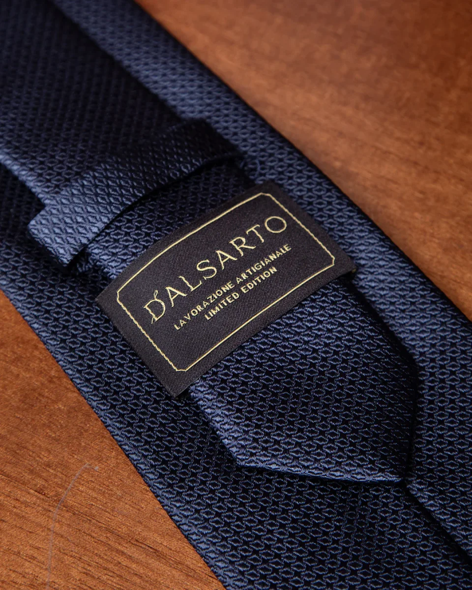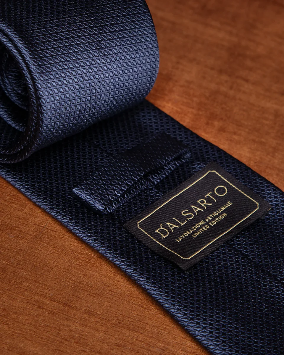Il cuore di questo modello risiede nella lavorazione nido d’ape un’architettura tessile a micro-celle che cattura la luce da diverse angolazioni. La base blu notte, profonda e istituzionale, acquista spessore visivo grazie ai riflessi dinamici che variano d’intensità, passando da toni cupi a sfumature più luminose e setose.