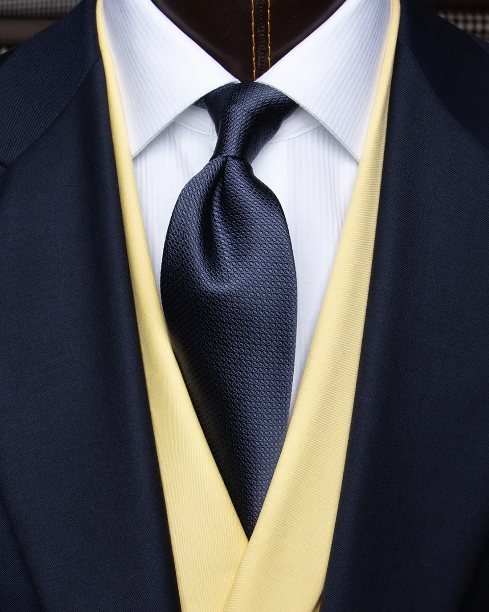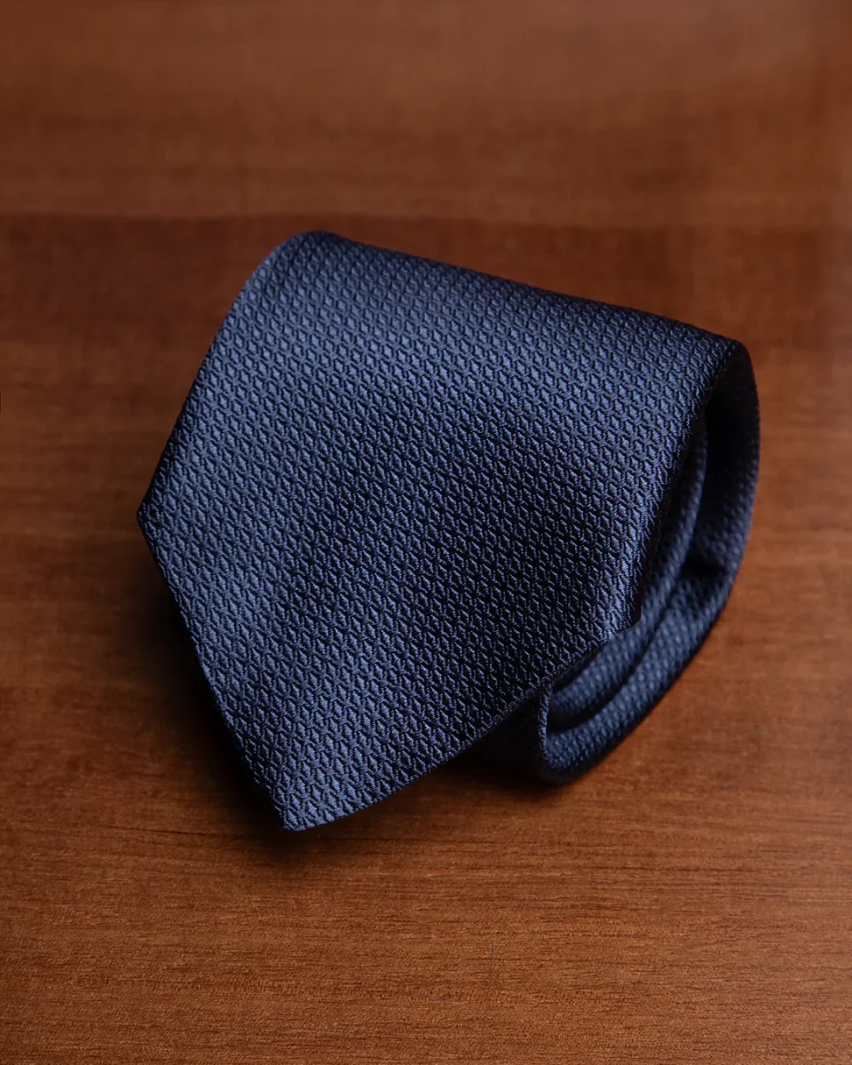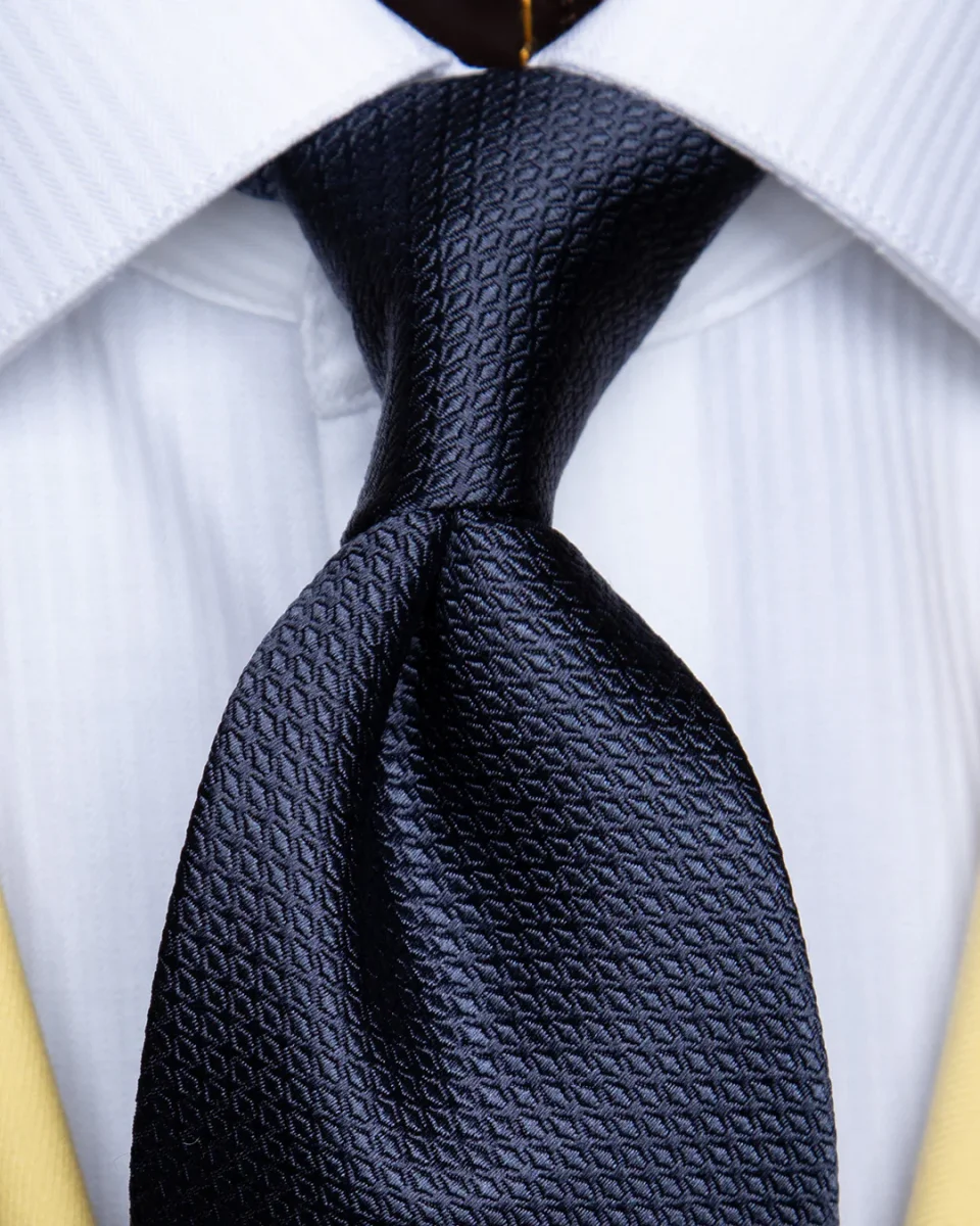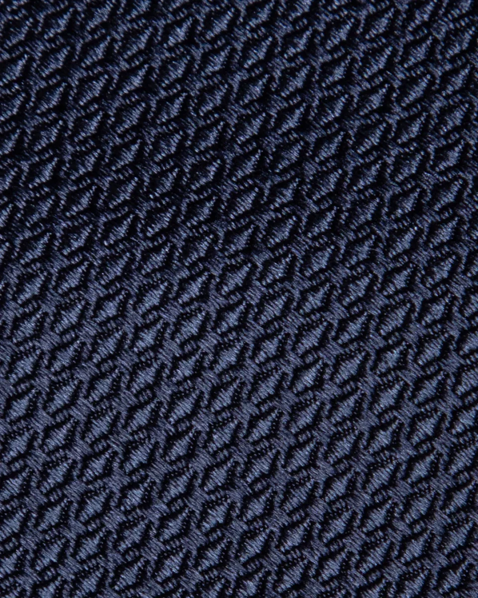 Il cuore di questo modello risiede nella lavorazione nido d’ape un’architettura tessile a micro-celle che cattura la luce da diverse angolazioni. La base blu notte, profonda e istituzionale, acquista spessore visivo grazie ai riflessi dinamici che variano d’intensità, passando da toni cupi a sfumature più luminose e setose.