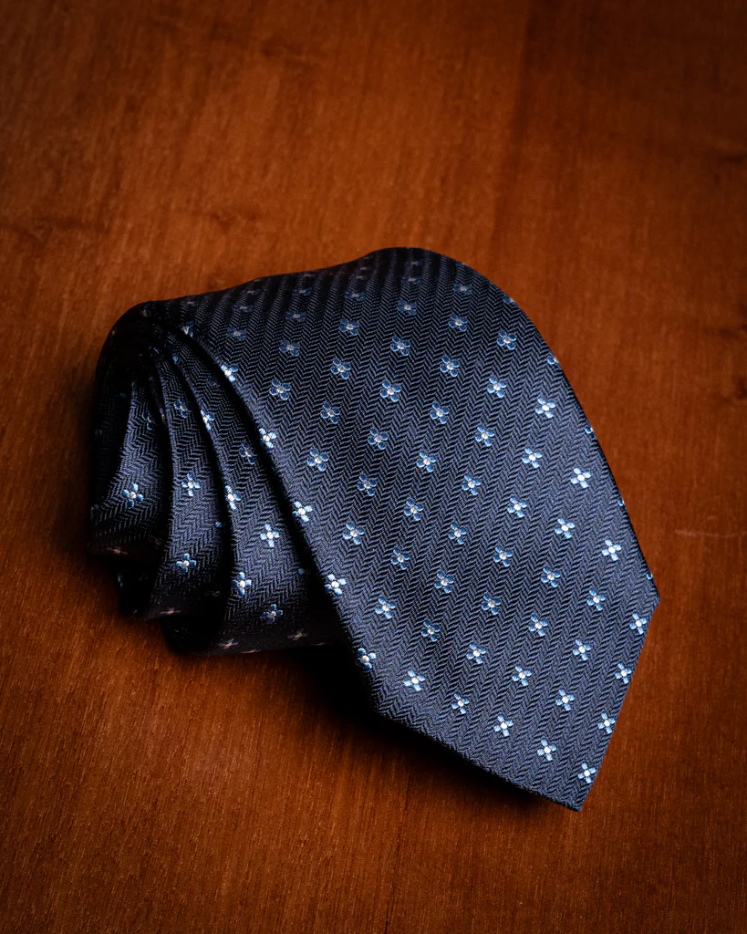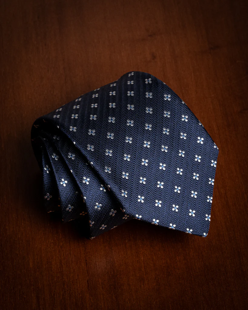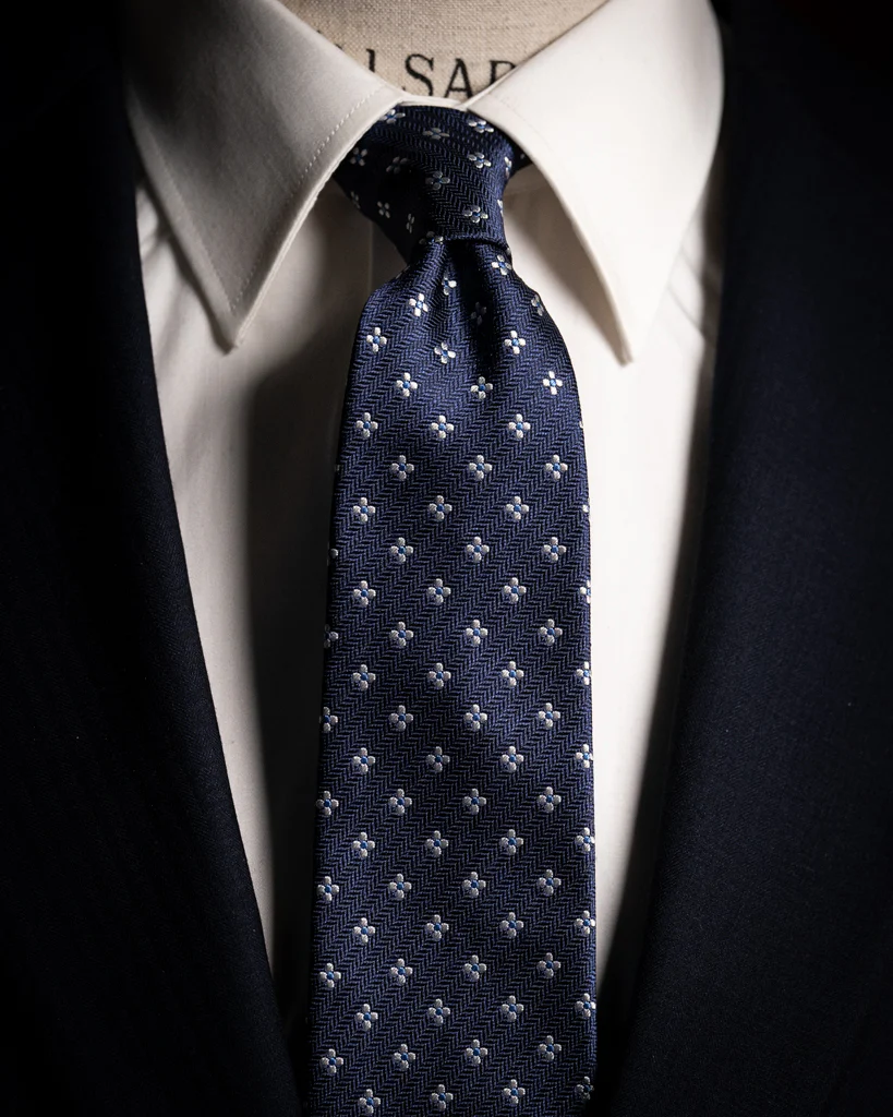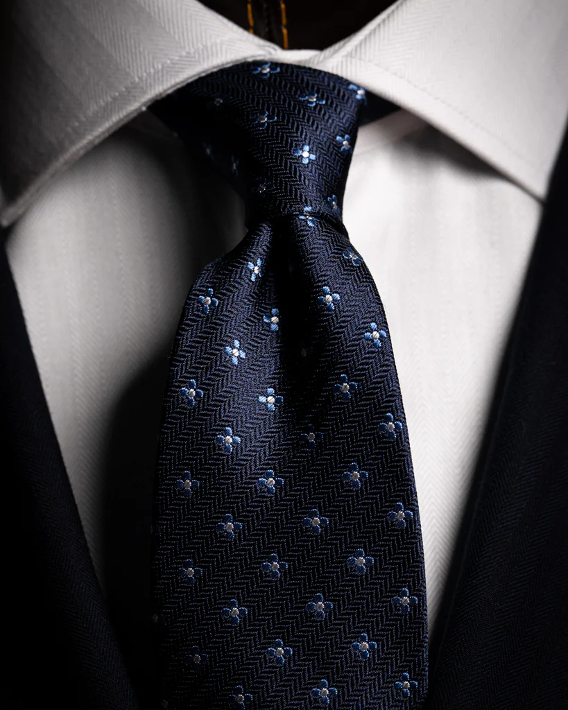 La Cravatta Spinata Blu Notte con Fiori è un capolavoro di equilibrio tessile, dove la geometria rigorosa dello sfondo incontra la libertà decorativa del motivo floreale, creando un accessorio di rara profondità visiva.