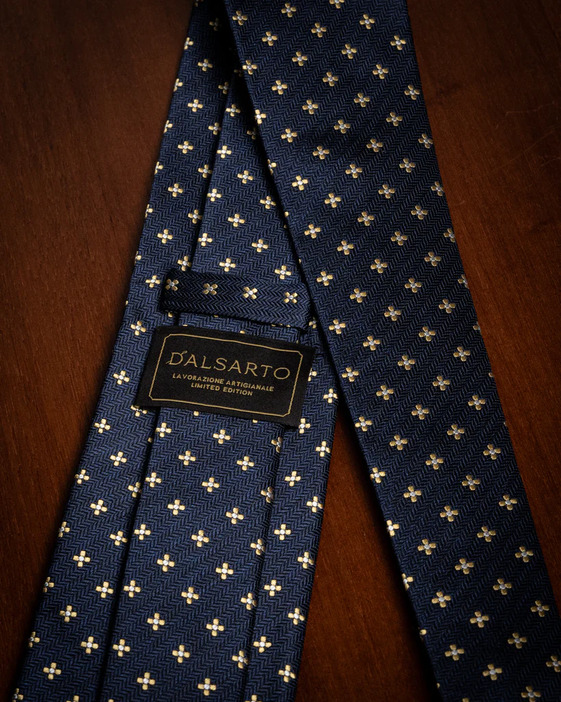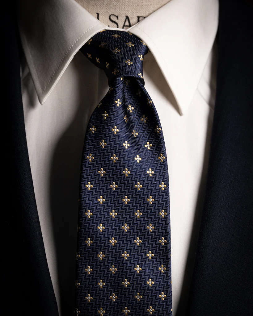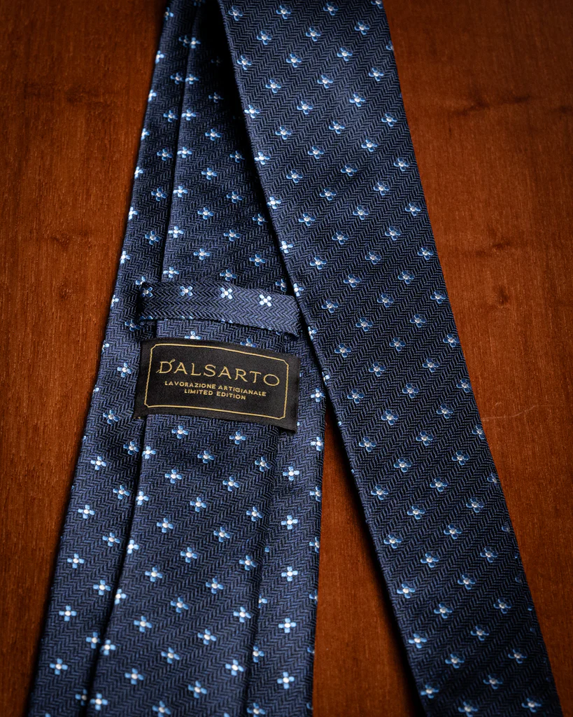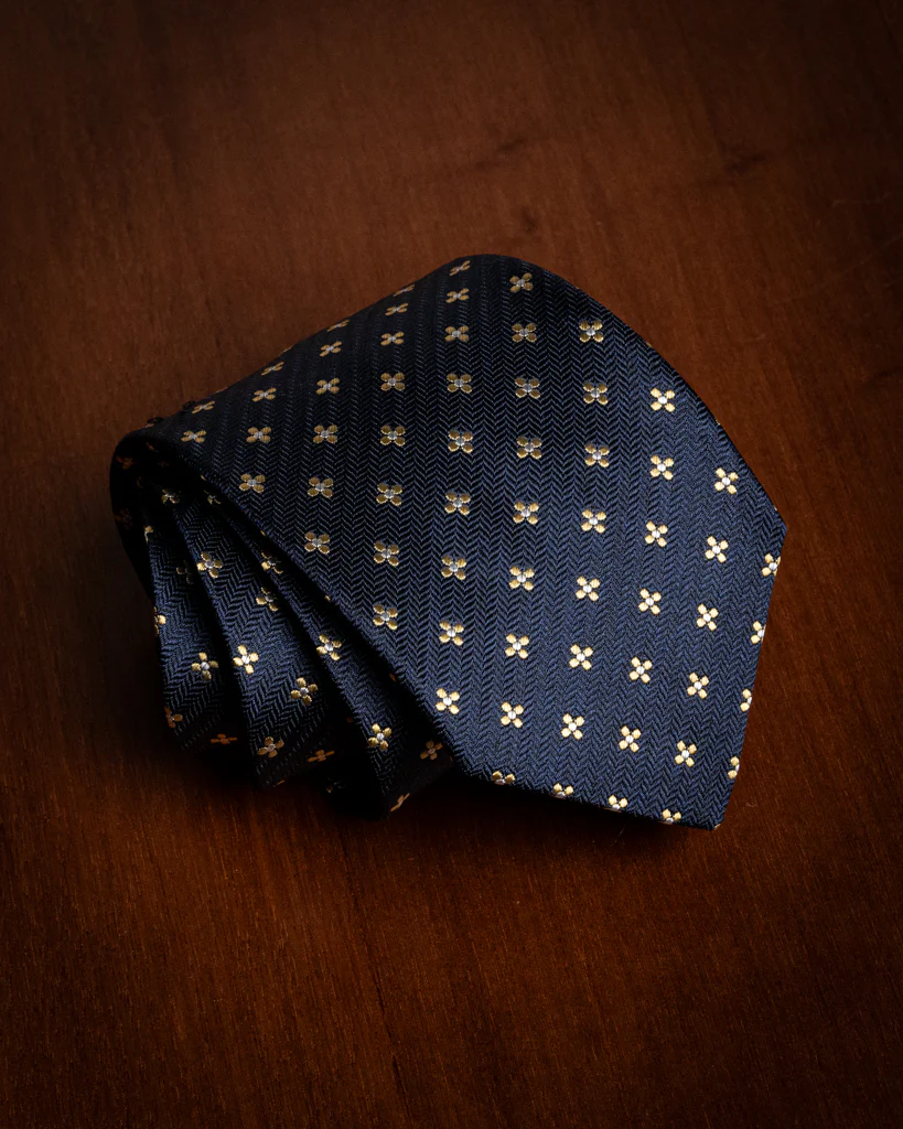 La Cravatta Spinata Blu Notte con Fiori è un capolavoro di equilibrio tessile, dove la geometria rigorosa dello sfondo incontra la libertà decorativa del motivo floreale, creando un accessorio di rara profondità visiva.