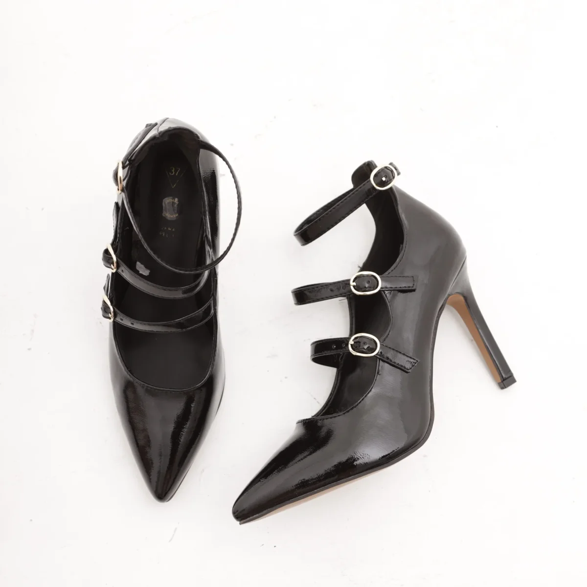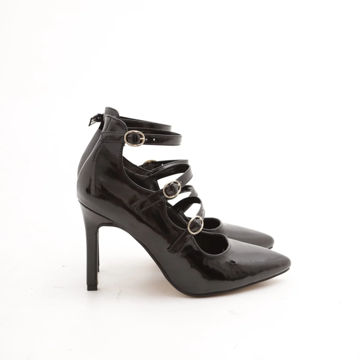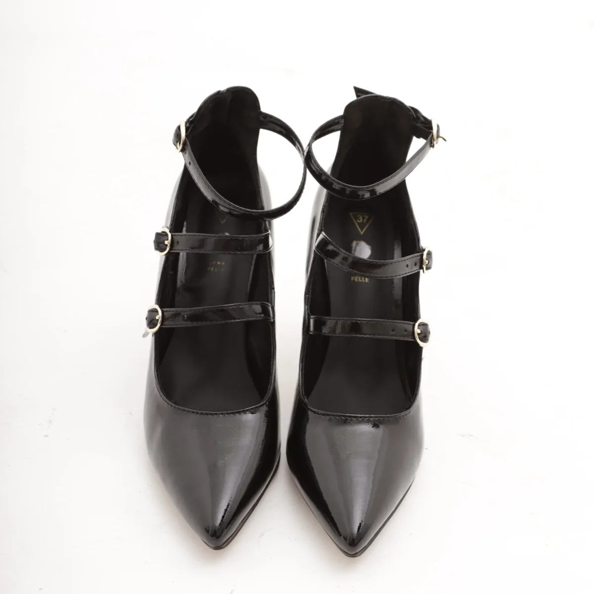 Scarpa Tacco Nero modello Decolletè realizzata in vernice. Caratterizzato da cinturi. Disponibile anche nel colore Bordeaux. Sottopiede in vera pelle.