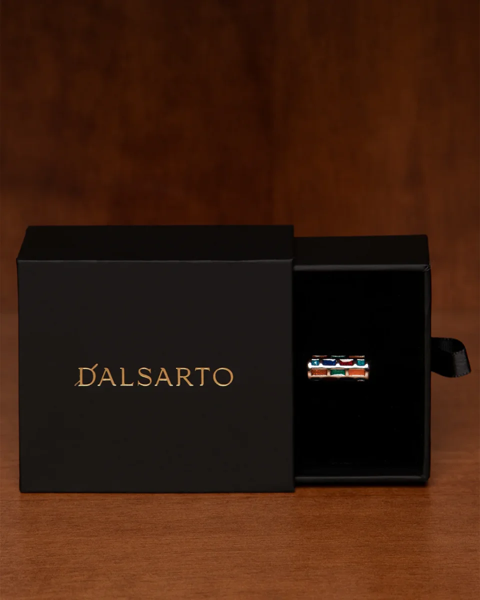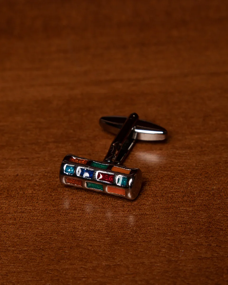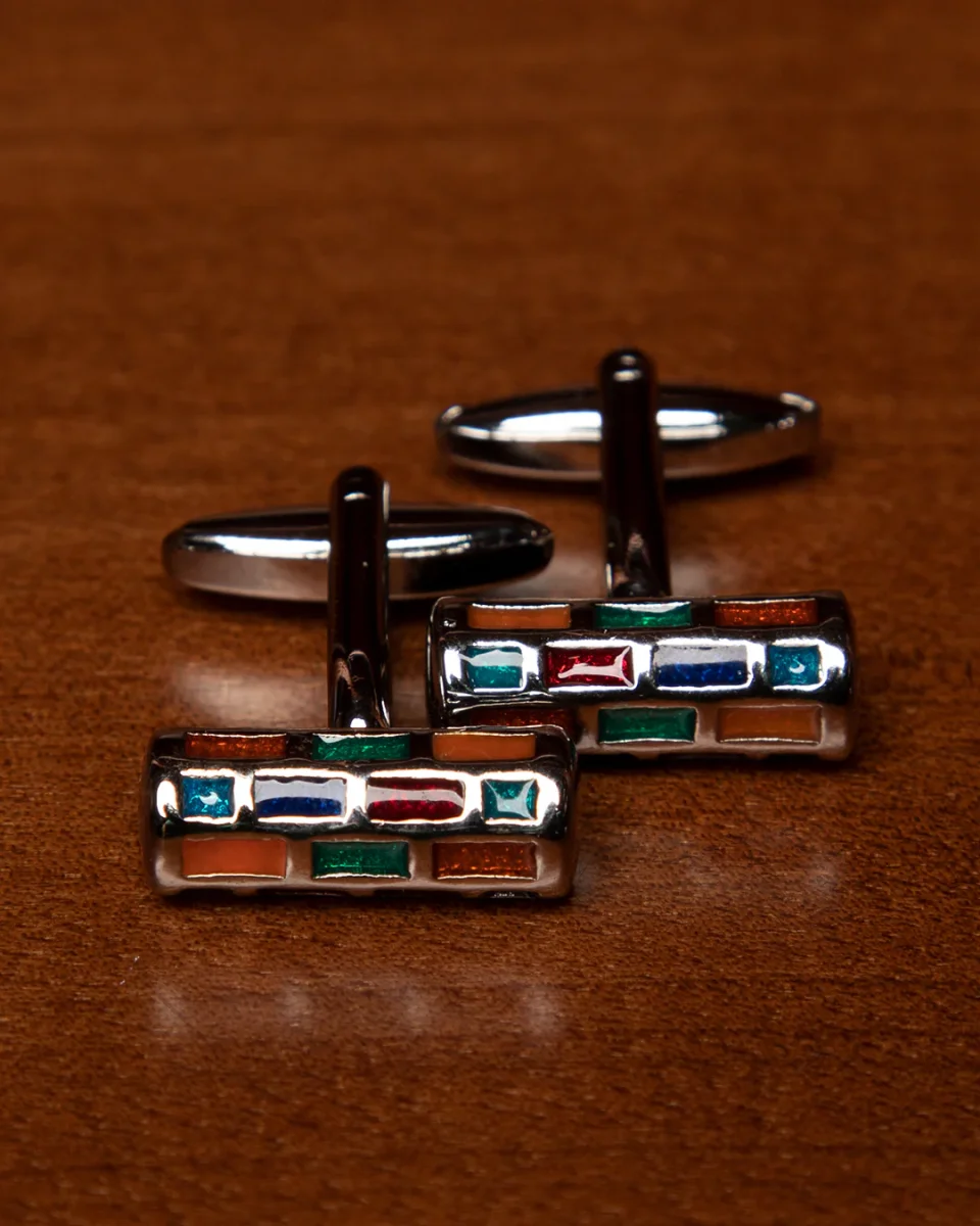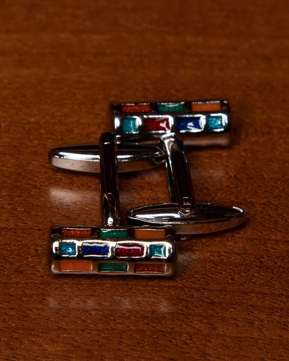 Gemelli in color argento dal profilo pulito, arricchiti da rettangoli multicolori disposti in una composizione geometrica. La finitura lucida valorizza i contrasti cromatici, offrendo un accessorio distintivo per occasioni formali o contesti professionali. Un equilibrio perfetto tra design moderno e eleganza discreta.