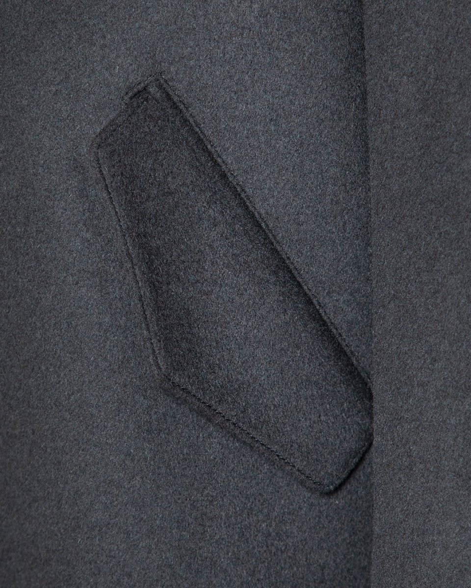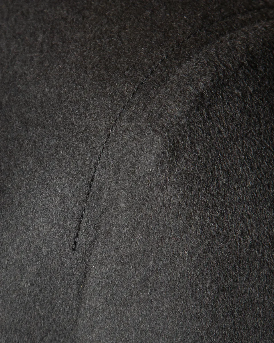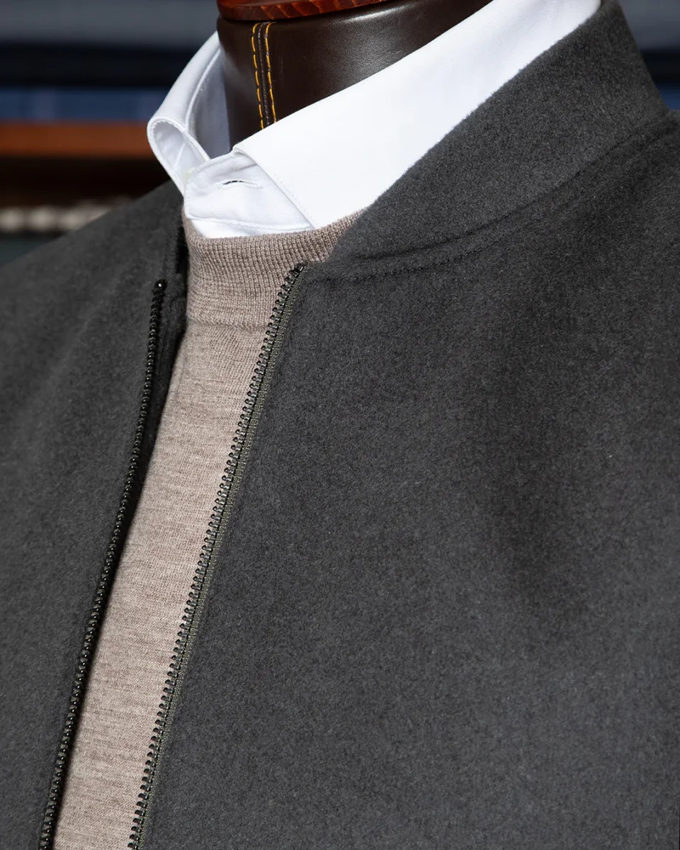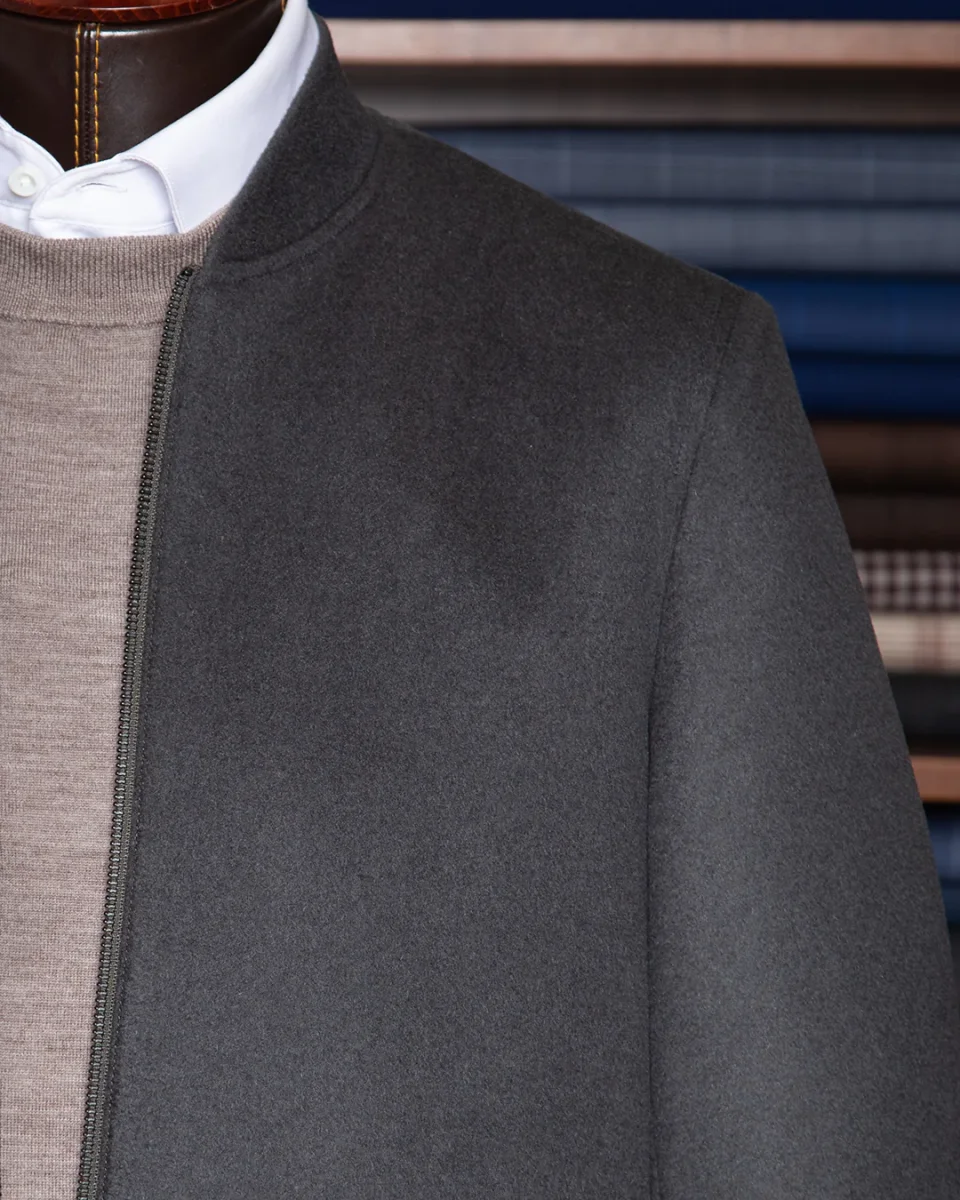 L’estetica è definita da un minimalismo d’avanguardia: la tonalità grigio scuro assicura un’eleganza sobria e versatile, mentre la costruzione della spalla e del busto mantiene l’autorità del taglio classico, elevando il concetto di luxury casual a un nuovo standard di eccellenza.
