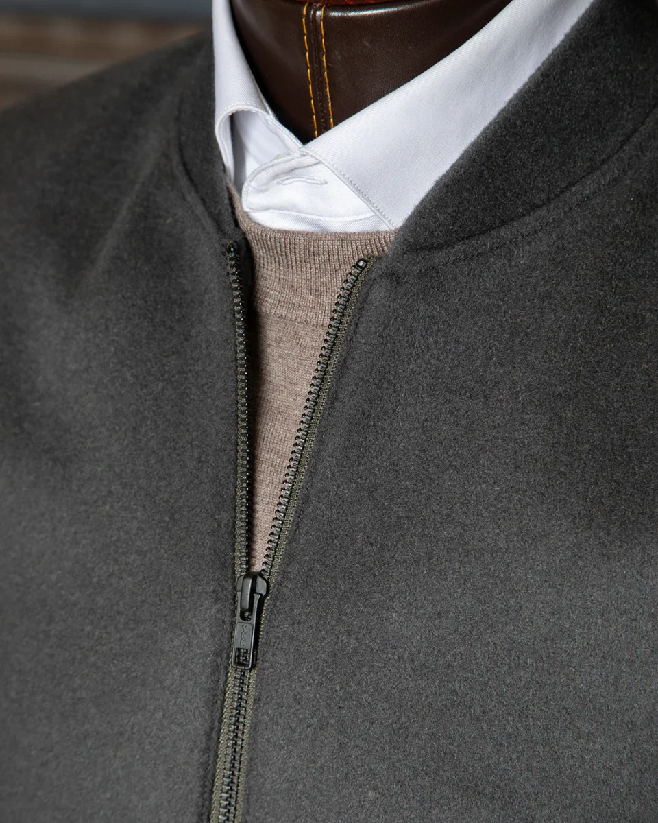 Il cuore del design risiede nell’integrazione della chiusura a zip, una scelta funzionale che trasforma la giacca in un elemento versatile e protettivo. La transizione tra il corpo della giacca e i dettagli tecnici è eseguita con una pulizia millimetrica, garantendo che la zip diventi un punto luce lineare e sofisticato su una struttura di assoluto rigore.