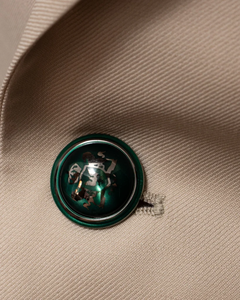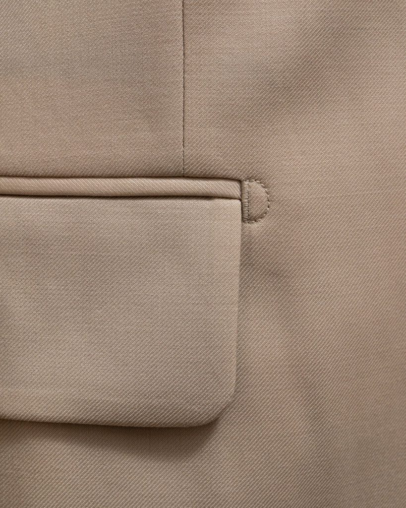 - Tasche: A pattina, un dettaglio classico che bilancia la natura destrutturata del capo, mantenendo una linea pulita sui fianchi.