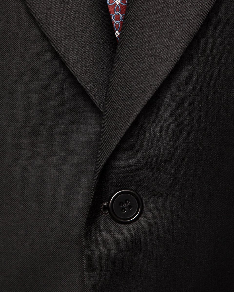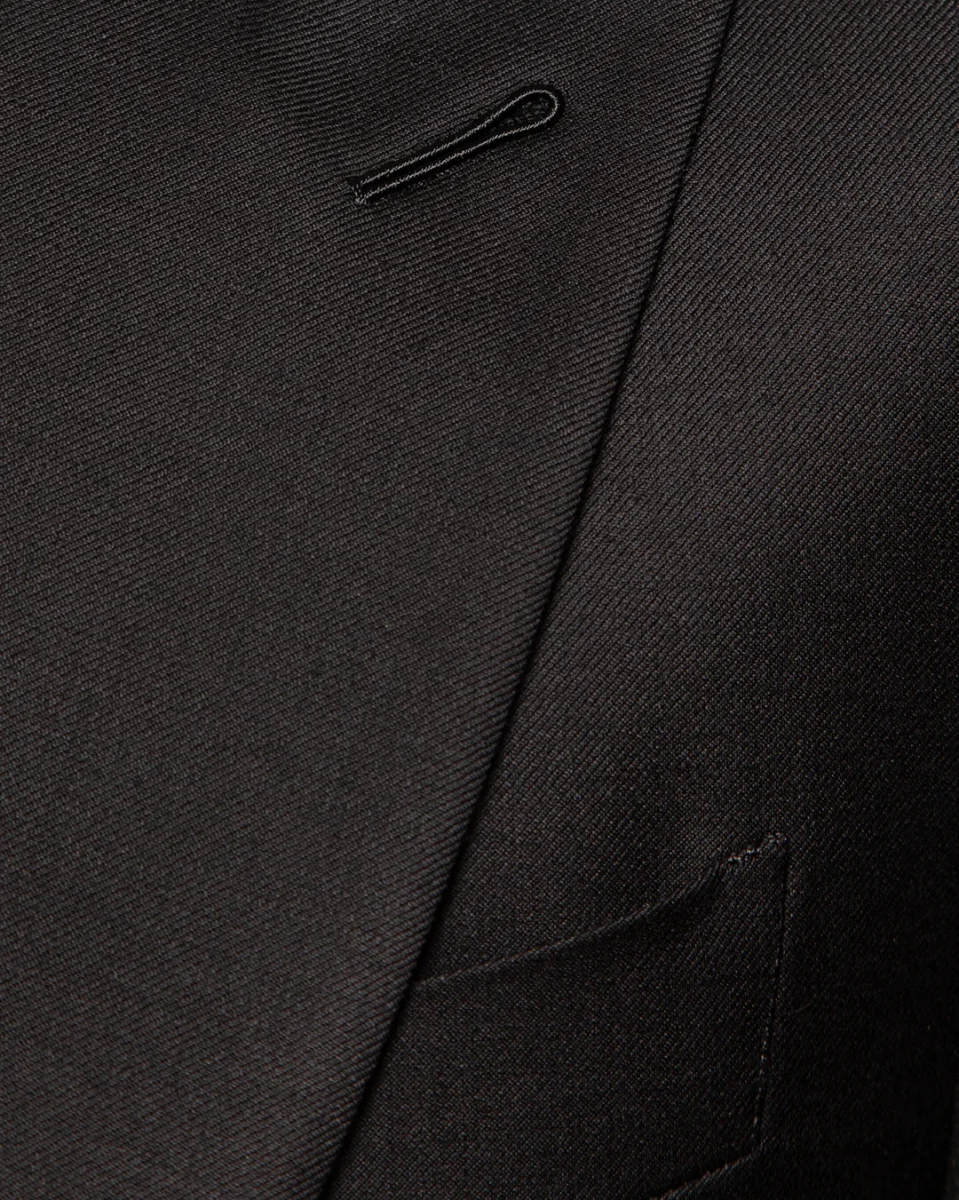 La Giacca Modernico incarna una visione del formalismo basata sulla sottrazione e sul mistero. Il focus primario è la sua costruzione a un unico bottone, una scelta stilistica che pulisce radicalmente il fronte, creando una linea continua e scultorea che valorizza il busto. Il tessuto Nero Unito, profondo e denso, agisce come una tela perfetta su cui spicca la configurazione a tasche a filetto, prive di pattine per evitare ogni interruzione visiva e mantenere la silhouette affilata.