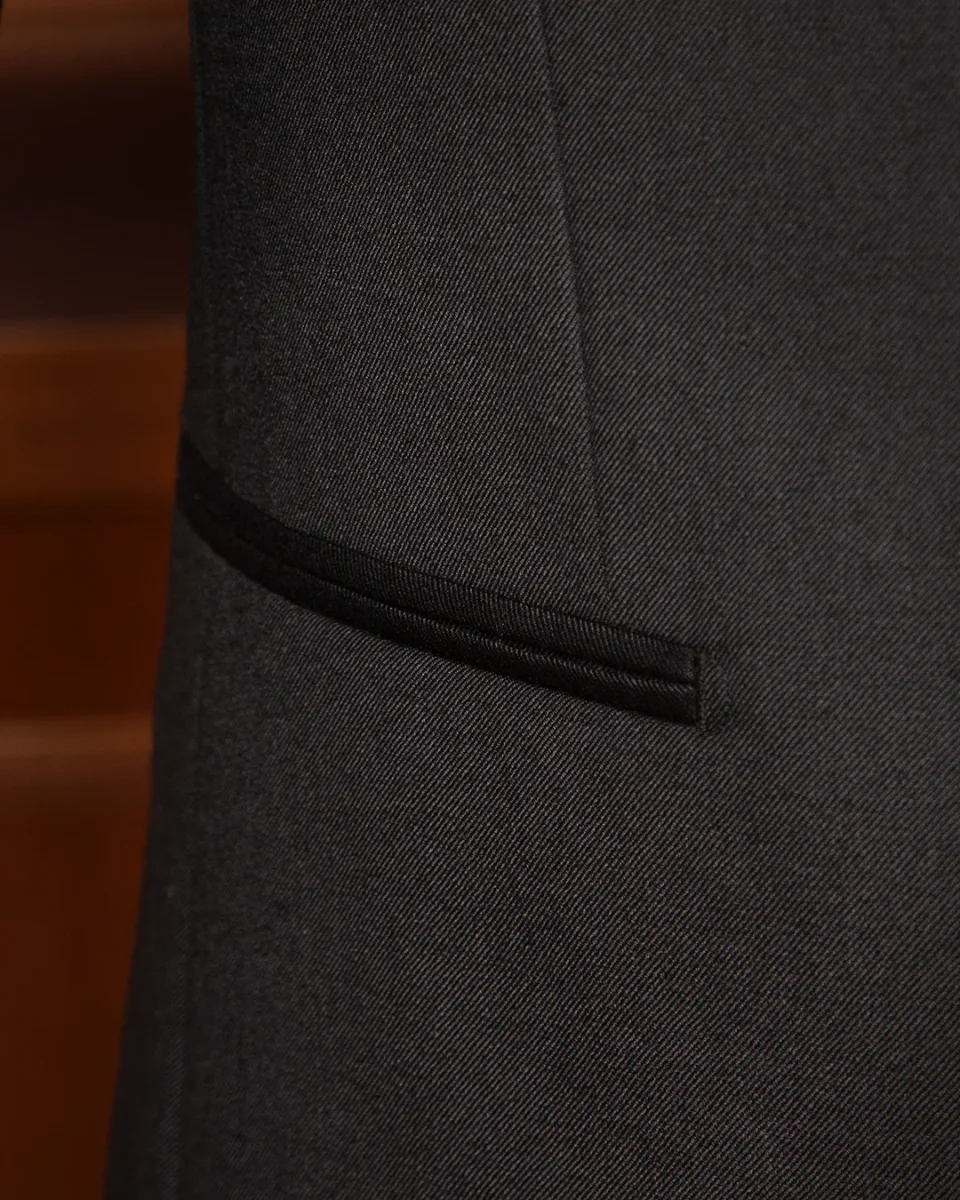 - Costruzione Fronte: Tasche a filetto (jetted pockets) per il massimo minimalismo.