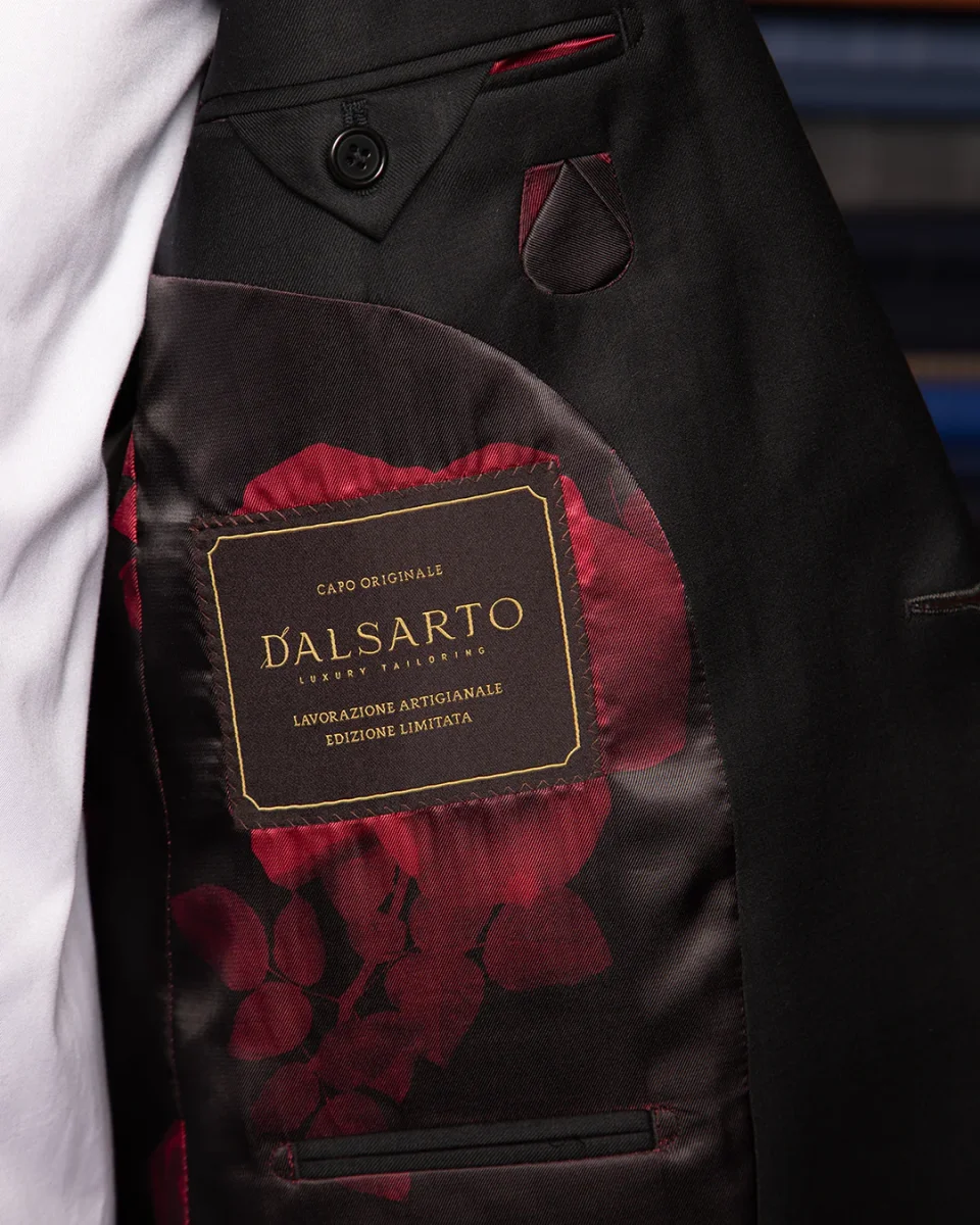 Il vero elemento di rottura, firma inconfondibile di questo modello, è la fodera interna rosa stampata in rosso. Questo contrasto audace e inaspettato rivela un’anima dandy e sofisticata, offrendo un’esperienza sensoriale unica a chi la indossa. Il bottone in tinta, scelto per fondersi cromaticamente con il tessuto esterno, ribadisce la volontà di un design minimale, lasciando che sia il taglio a definire l’autorità del capo.