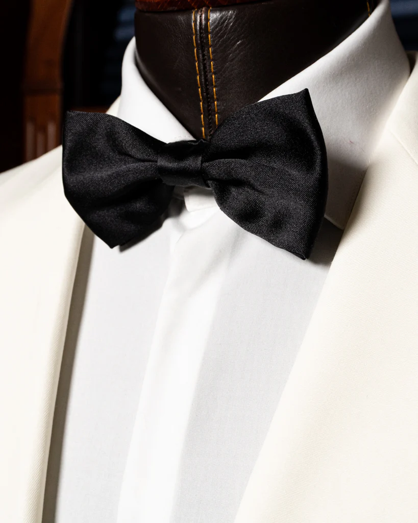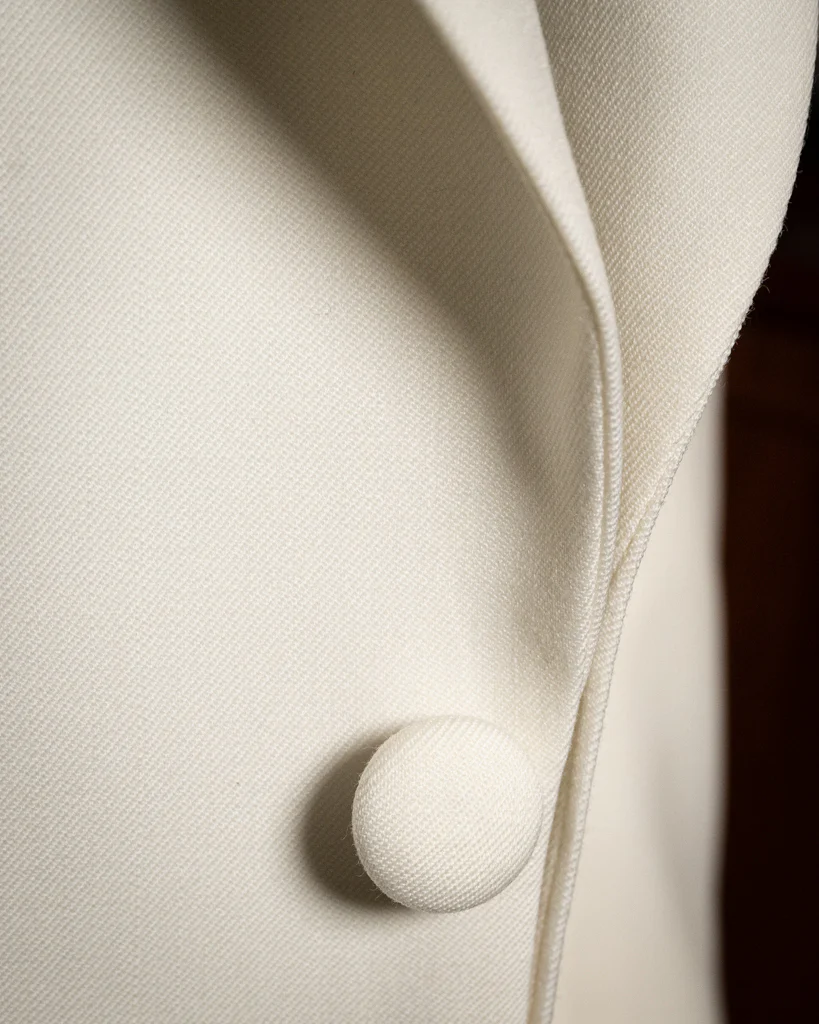 - Dettagli Sovrani: Bottone centrale e bottoni alle maniche ricoperti nel medesimo tessuto.