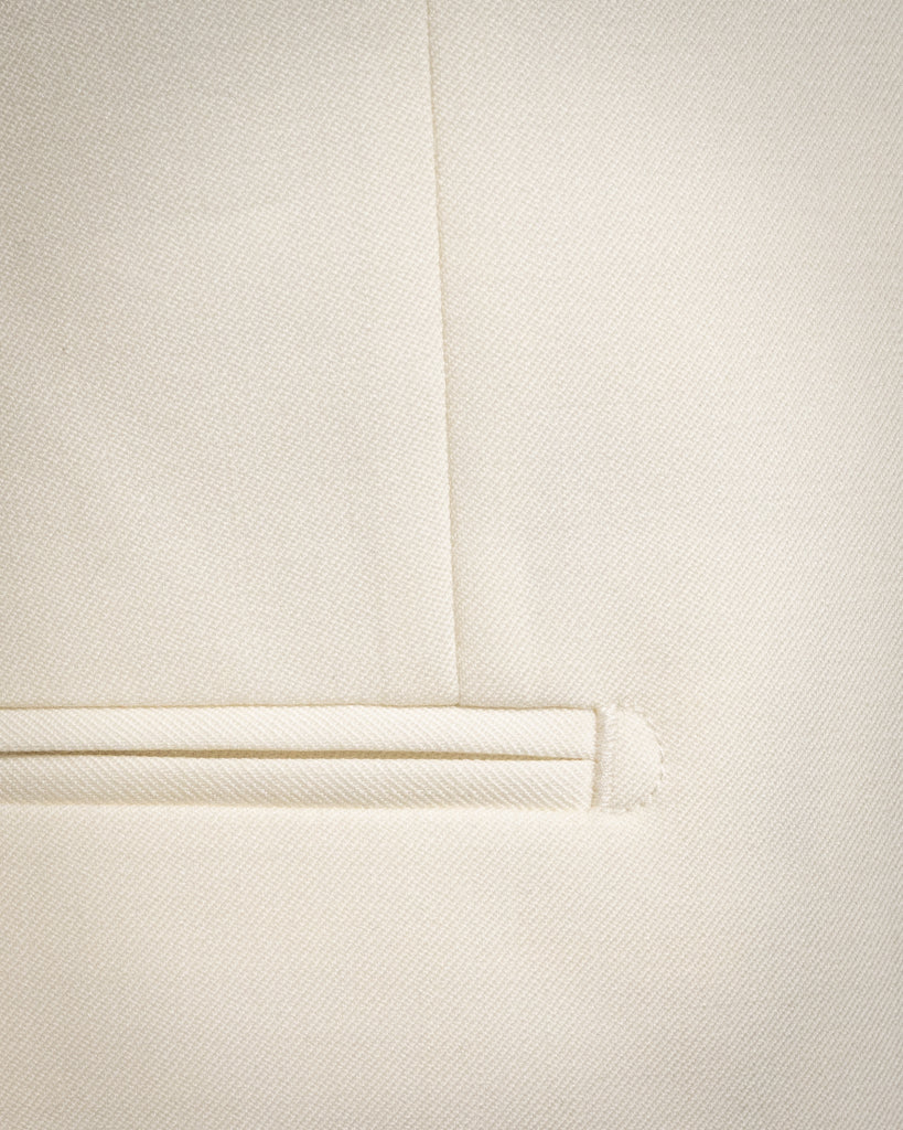 La scelta delle tasche a filetto sottolinea la volontà di mantenere una silhouette piana e architettonica, priva di volumi esterni superflui. Ogni dettaglio è studiato per la massima coerenza: dal bottone ricoperto nello stesso tessuto della giacca alla fodera integrale in tinta, che garantisce un’estetica monocromatica impeccabile anche all’interno. La costruzione in lana Super 120s assicura una mano scattante, traspirabilità e un appiombo che sfida le pieghe.