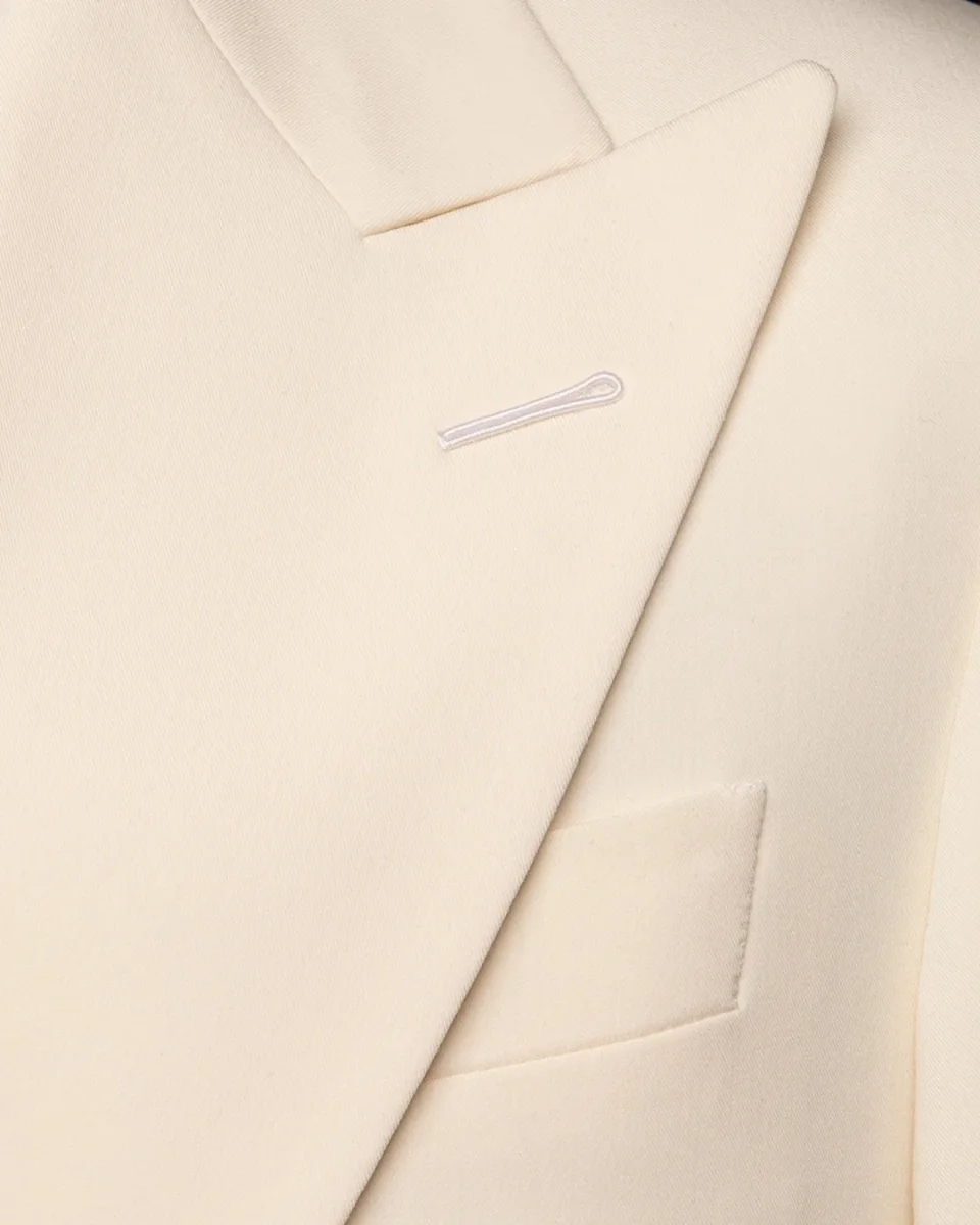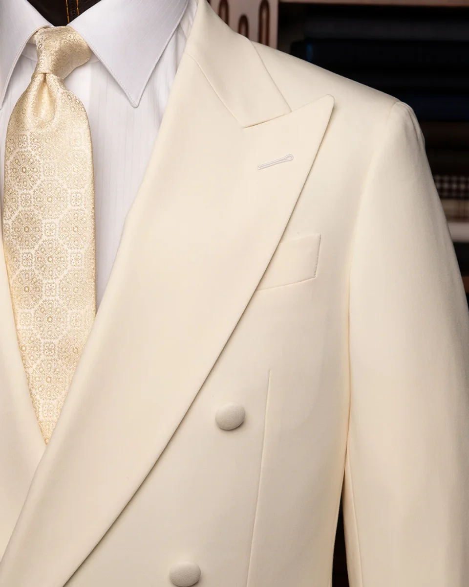 - Tessuto: Lana superiore o misto seta, scelta per la sua capacità di riflettere la luce in modo uniforme e mantenere un bianco ottico impeccabile.