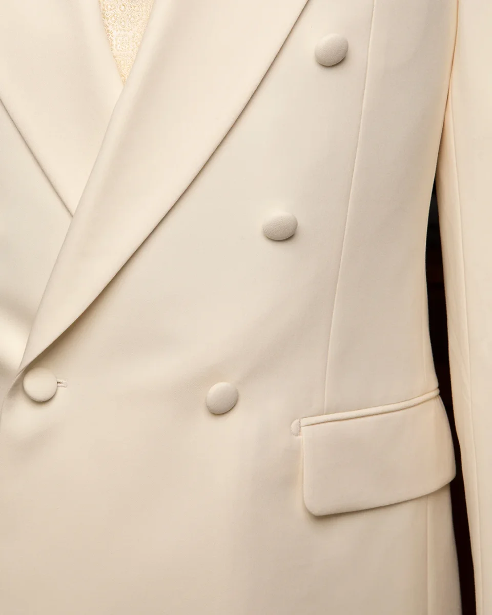 Il modello Perugino reinterpreta il concetto di cerimonia e gala attraverso una configurazione 6×1: sei bottoni totali con un unico punto di chiusura sapientemente posizionato in basso. Questa scelta tecnica crea un rever profondo e slanciato che apre il busto, conferendo una silhouette atletica e di grande impatto. Il Bianco Unito, puro e senza compromessi, trasforma la giacca in una dichiarazione di stile assoluta, ideale per eventi estivi esclusivi o per un red carpet dal sapore contemporaneo.