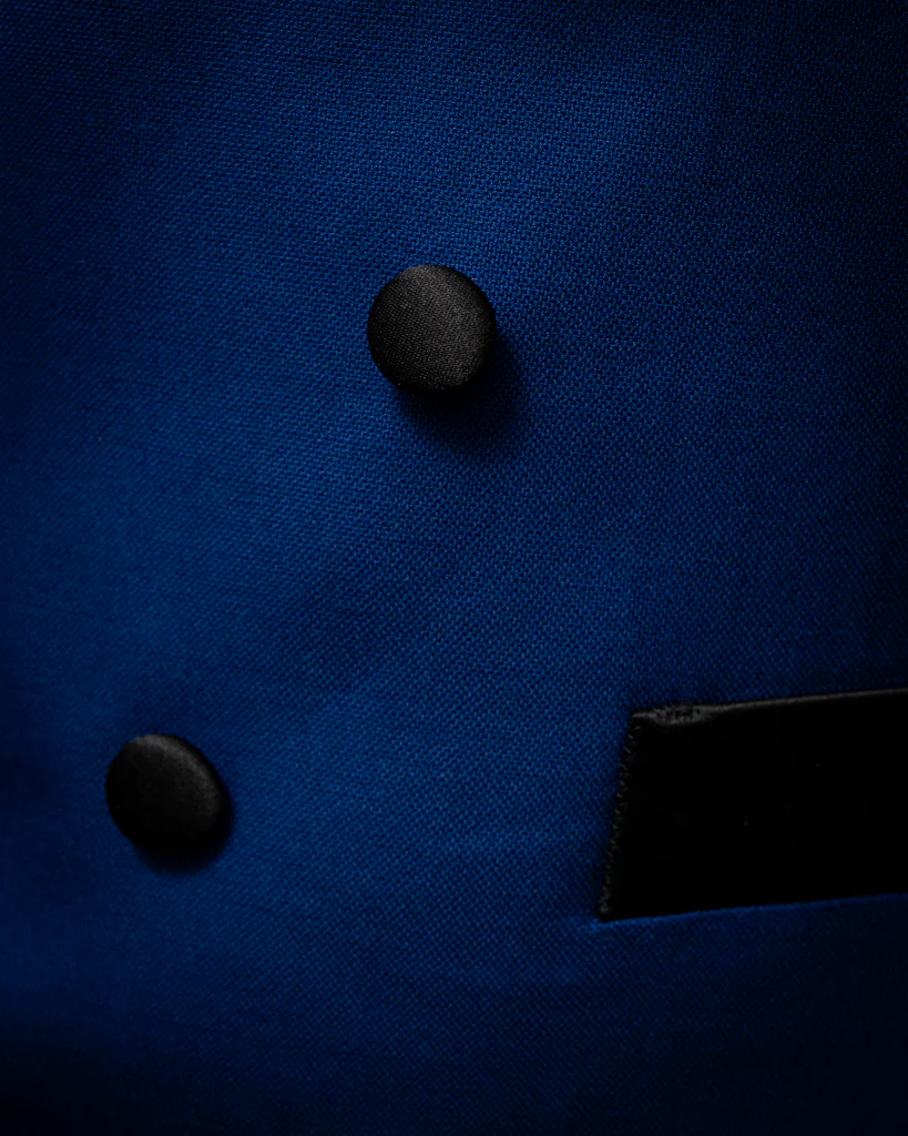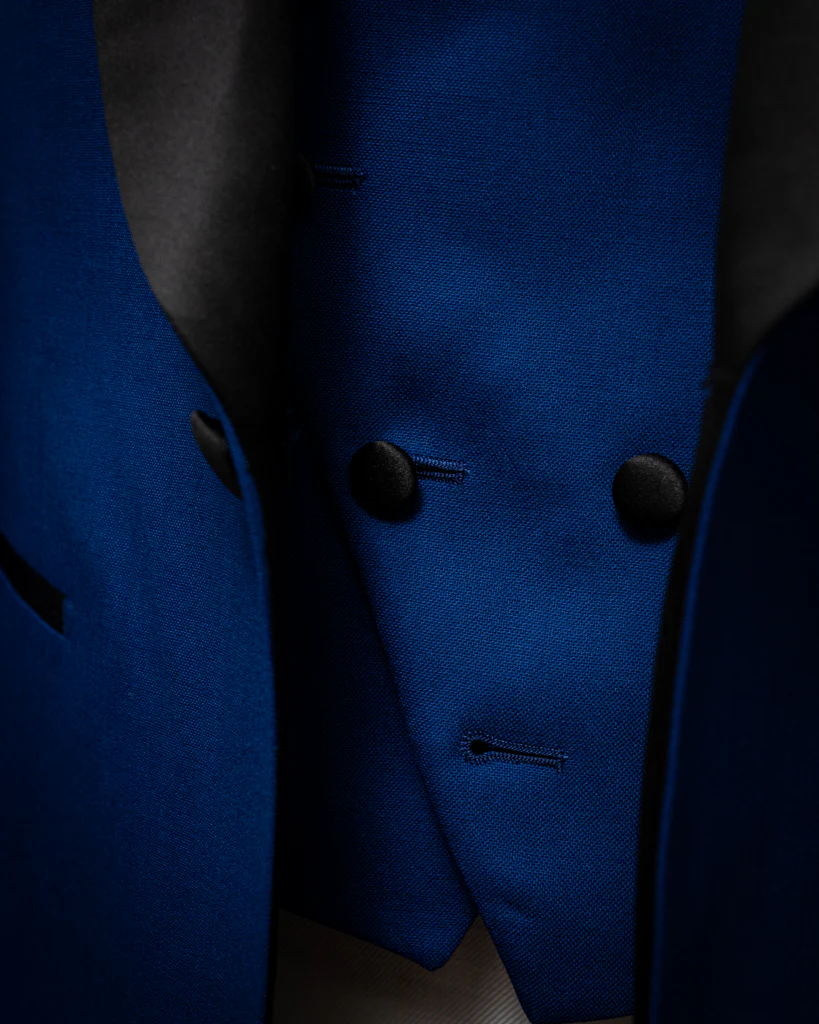 Questo gilet non è un semplice sottogiacca, ma un protagonista assoluto in questo caso. Realizzato nel nostro vibrante tessuto Blu Acceso , si distingue per una chiusura a cinque bottoni disposti a scalare, che crea un effetto visivo dinamico e moderno. Il contrasto con il Raso Nero dei dettagli trasforma il capo in un ponte stilistico tra il corpo della giacca e il rigore degli accessori da sera.