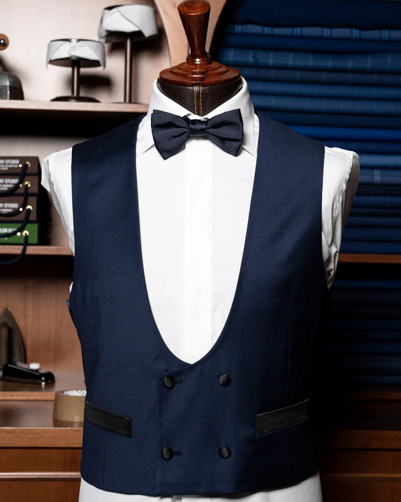La caratteristica distintiva è infatti il fondo dritto (“paro”): a differenza dei gilet moderni con le punte, questo modello chiude orizzontalmente sulla vita. Questa geometria, tipica dell’eleganza White Tie e del Black-Tie d’epoca, copre perfettamente la cintura dei pantaloni, creando una transizione netta e pulita verso la gamba. Lo scollo a U profondo senza rever mantiene il petto libero per esaltare lo sparato della camicia e i dettagli in raso della giacca.