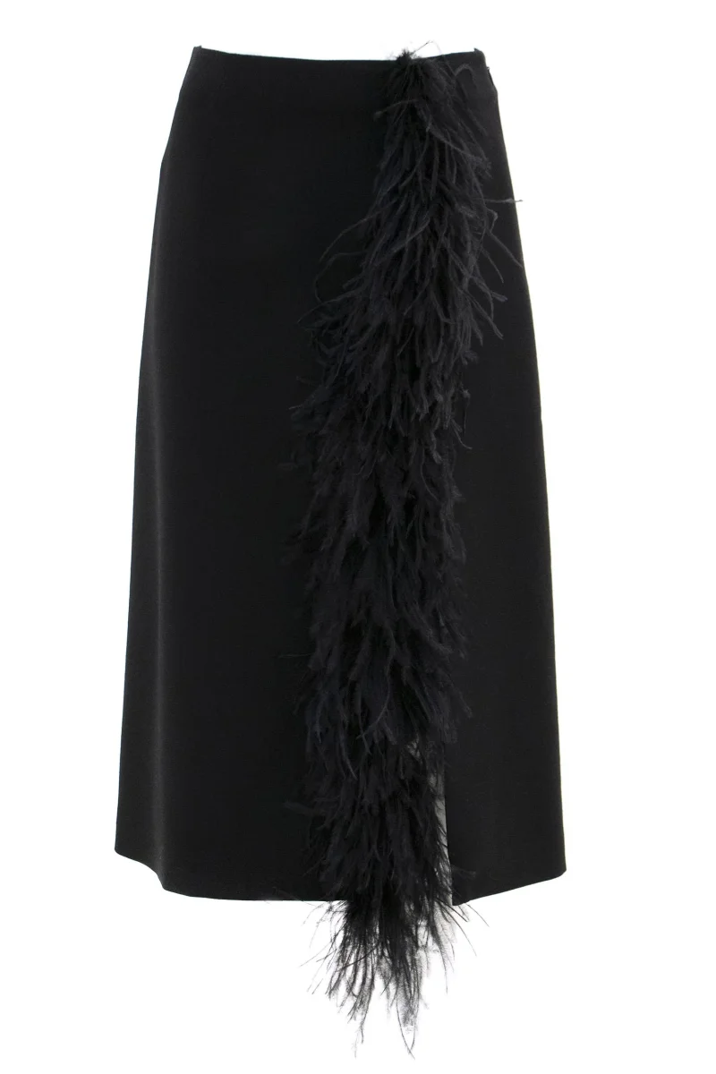 Gonna Composizione: esterno: 100% lana vergine; decorazioni: piume di tacchino e struzzo; fodera: 100% viscosa.”