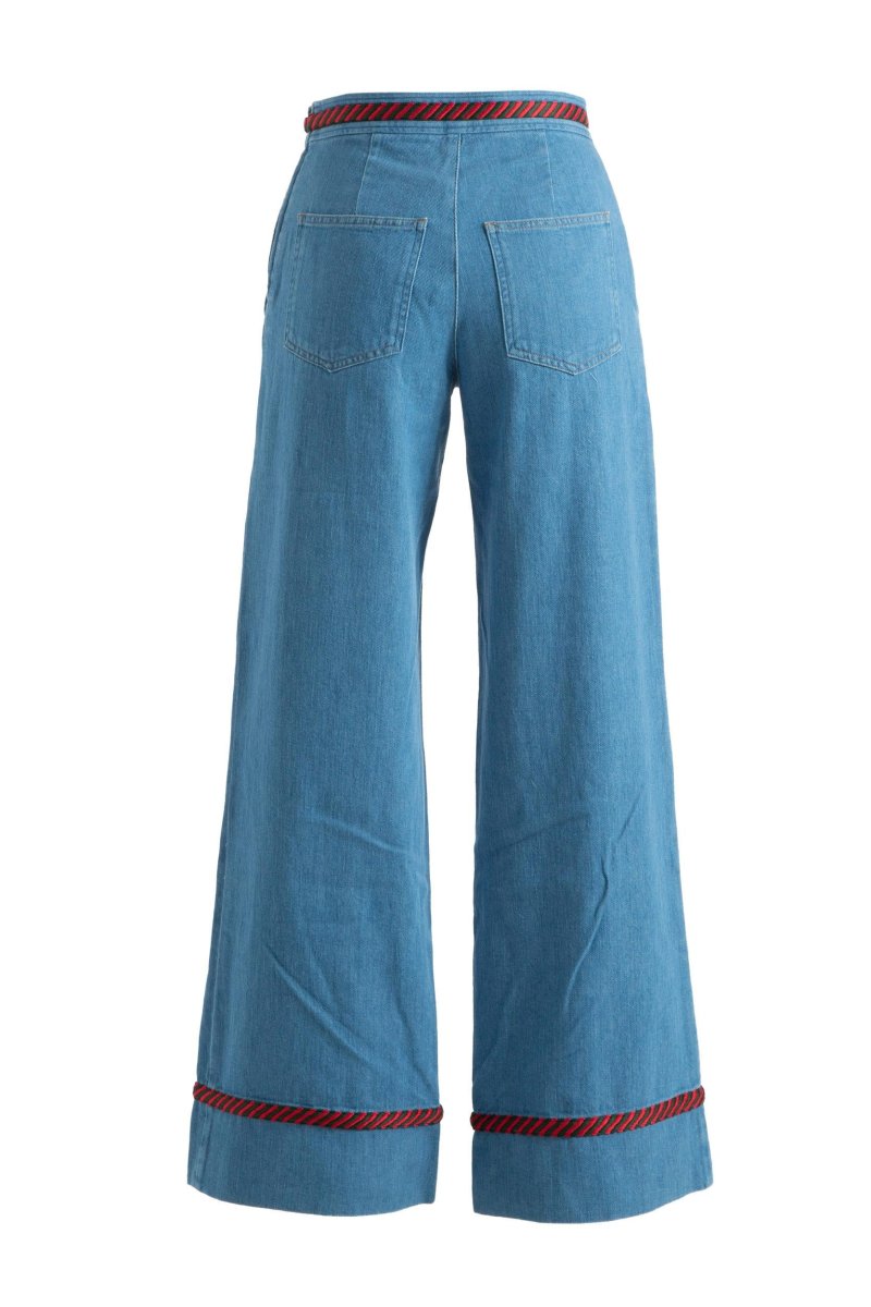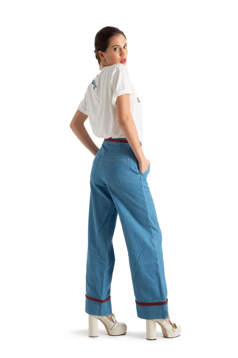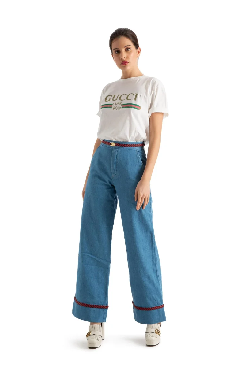Stile 70s alla maniera di Gucci con i nuovi jeans a gamba larga in arrivo dalla collezione Cruise della maison fiorentina. Il taglio a vita alta in denim azzurro è reso ancora più fascinoso dai dettagli ricamati con l’iconico motivo Web a righe rosse e verdi. L’orlo cropped a taglio vivo metterà in risalto i vostri stivaletti preferiti