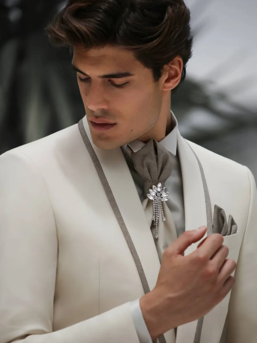 “Un abito distintivo e sofisticato, realizzato in un insolito color borgogna, che cattura l’attenzione con la sua intensità e profondità. Il tessuto melange conferisce una texture unica, un gioco di sfumature che dona movimento e luce al completo, creando un effetto visivo elegante e ricercato.