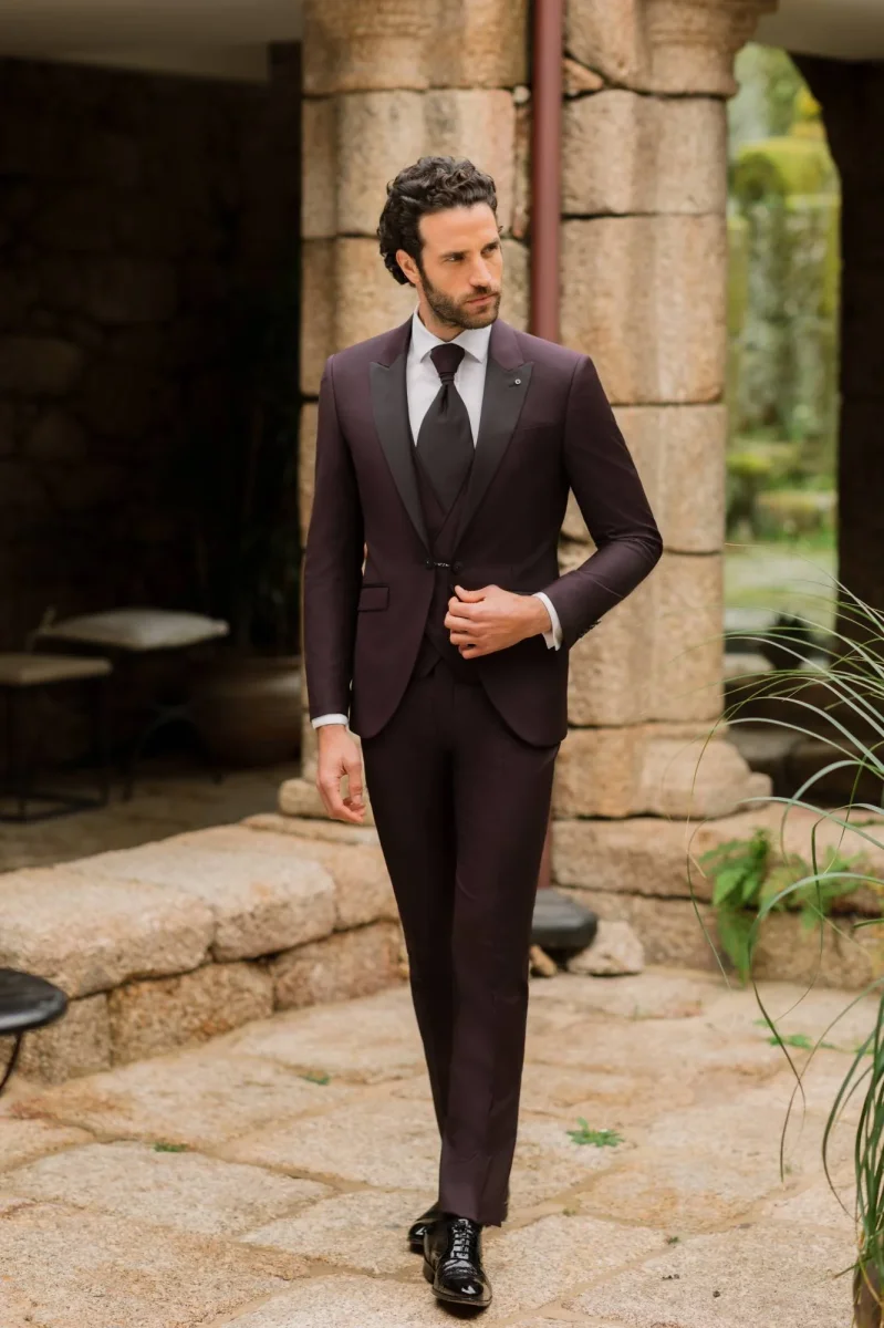 La giacca, con un taglio sartoriale impeccabile, offre una vestibilità slanciata e una silhouette affusolata, mentre il pantalone, dal taglio affusolato e moderno, completa l’outfit con eleganza. Il colore borgogna trasmette una sensazione di calore ed originalità, perfetto per chi cerca un’alternativa alle tonalità più convenzionali senza rinunciare alla raffinatezza.