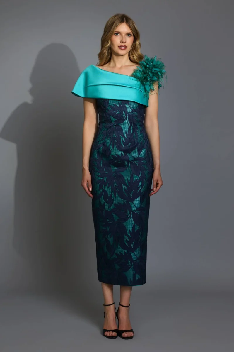 Un modello scenografico e raffinato che esprime la quintessenza degli abiti da cerimonia. Questo tubino midi in jacquard foliage blu petrolio scolpisce la silhouette con una linea affusolata e confortevole, mentre lo scollo asimmetrico in mikado turchese avvolge le spalle con movimento architettonico. Lo scollo monospalla è impreziosito da un corsage tridimensionale che illumina il volto e rende il capo unico, perfetto per chi cerca un abito dal carattere distintivo.