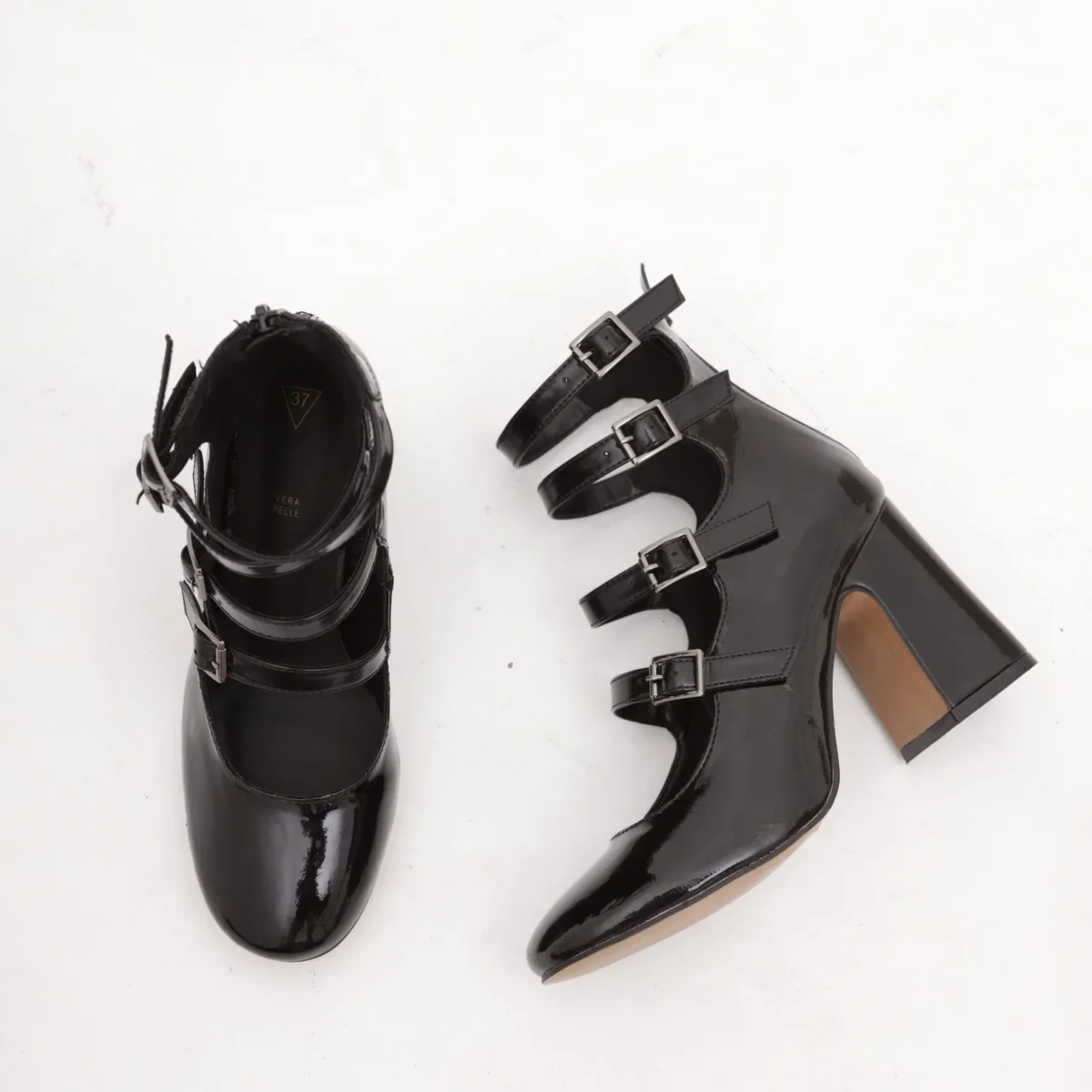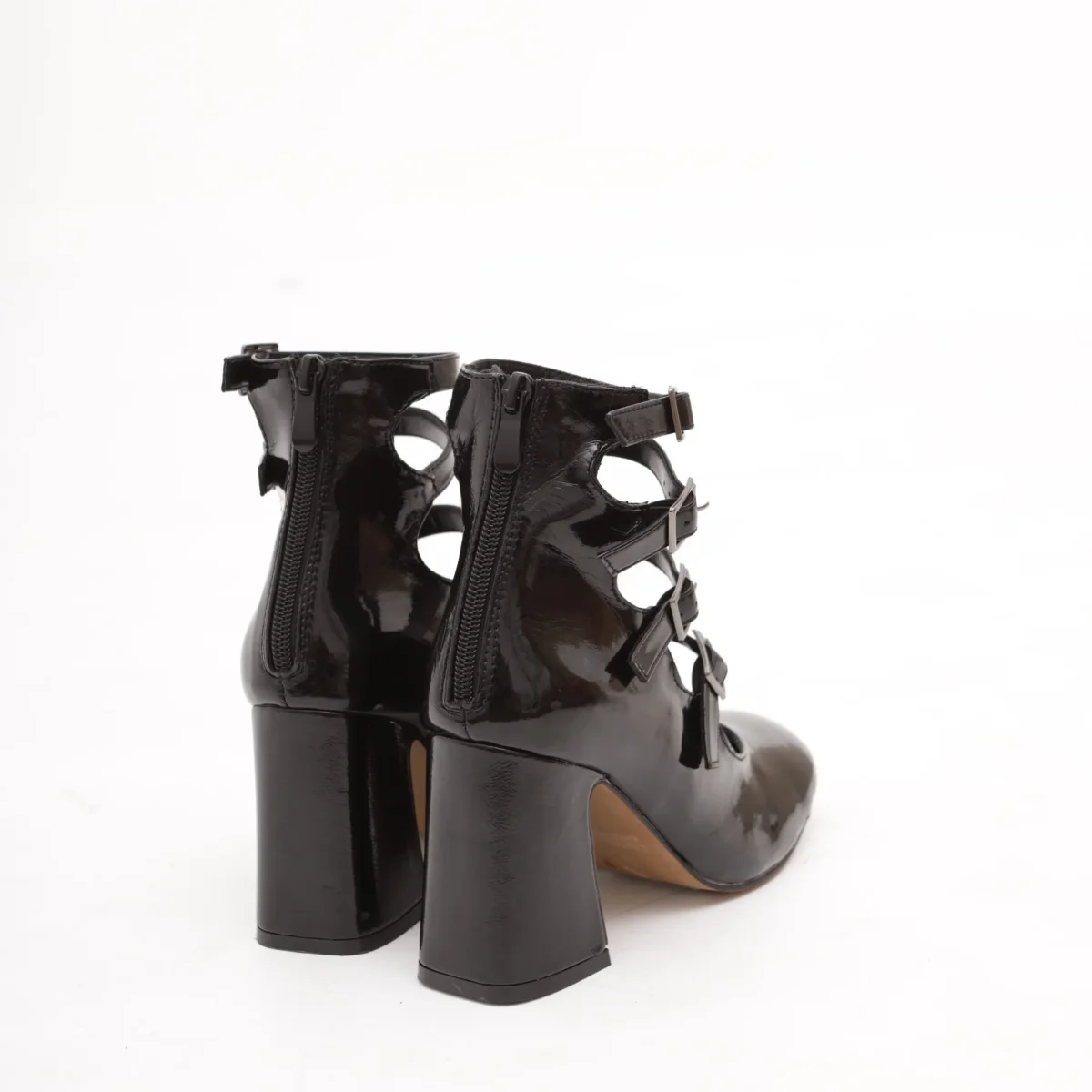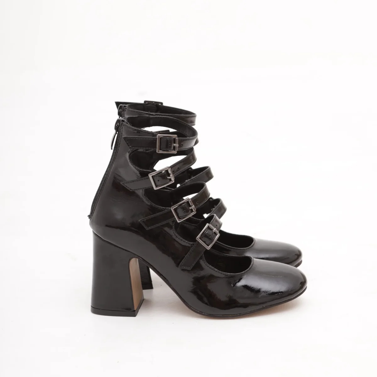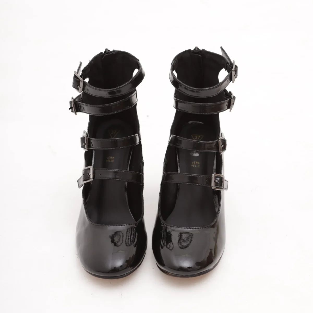 Modello scarpa con tacco realizzato in vernice Nero. Caratterizzato da cinturini sulla parte anteriore. Sottopiede in vera pelle.