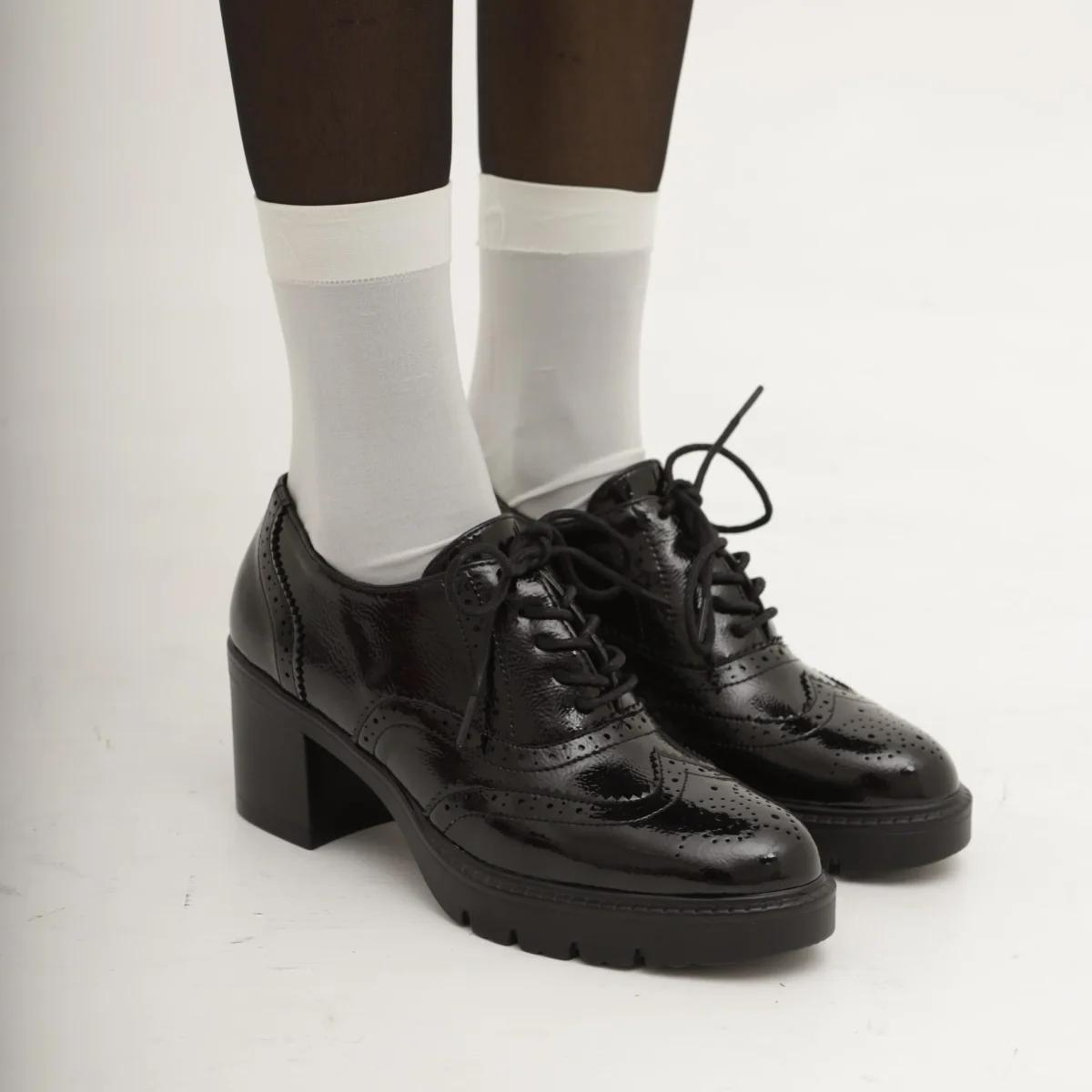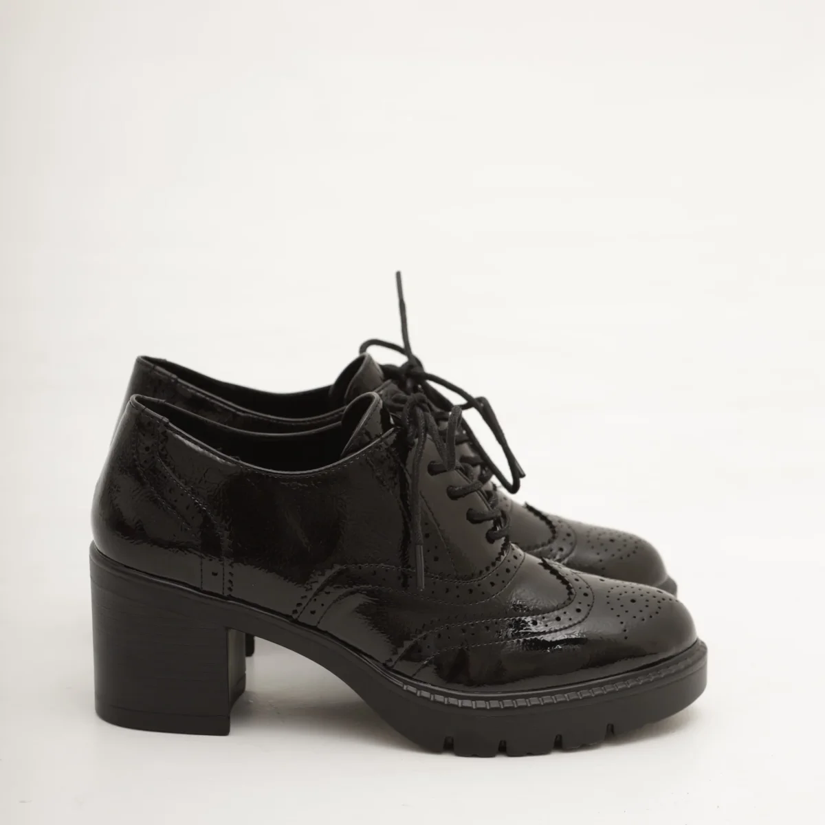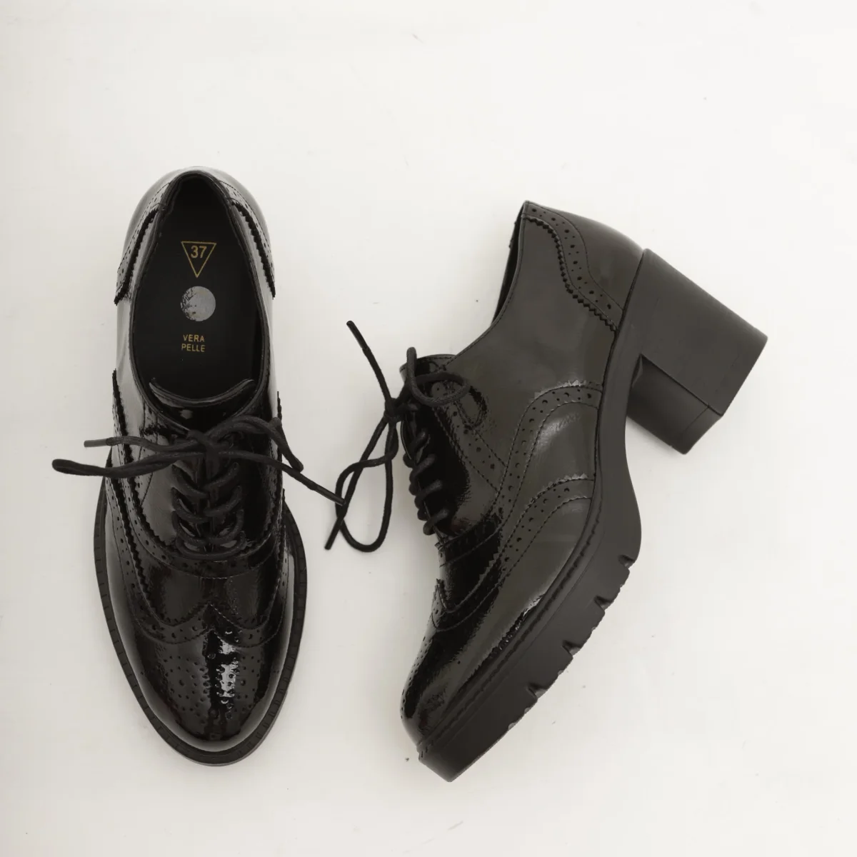 Scarpa con tacco in vernice colore Beige. Con dettaglio dorato sul tacco e cinturino alla caviglia regolabile. Disponibile anche in Nero.
