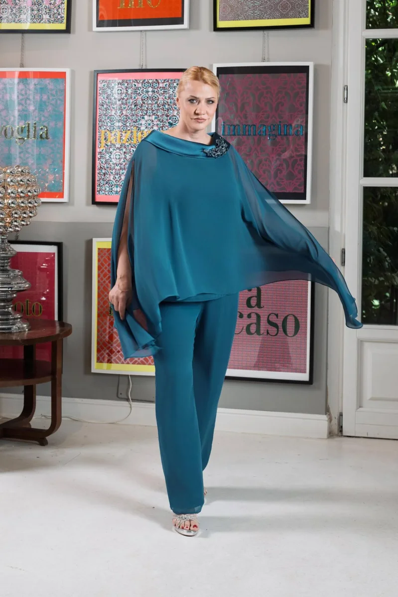 Un completo pantalone da cerimonia che unisce eleganza e modernità. Realizzato in un raffinato tono petrolio, si distingue per la sua linea fluida e armoniosa, capace di valorizzare la silhouette con naturalezza. La casacca in chiffon leggero con scollo tondo è impreziosita da un’applicazione gioiello sulla spalla e da un ampio taglio che crea un effetto mantella, donando movimento e leggerezza ad ogni passo. I pantaloni coordinati, dal taglio dritto e scivolato, completano l’insieme con sobrietà e raffinatezza. Un outfit pensato per le donne che desiderano sentirsi comode ma al tempo stesso protagoniste nelle occasioni speciali.