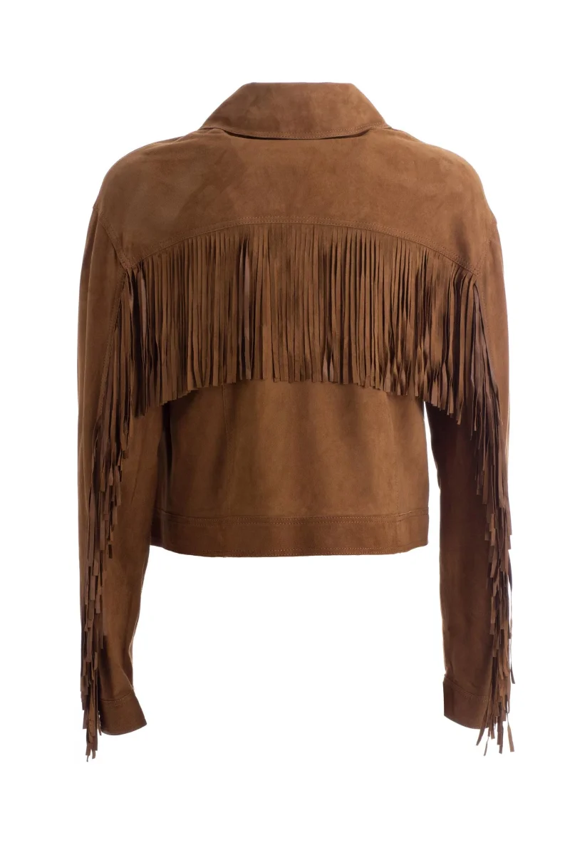 Giacca con Frange in 100% pelle di capra. Prodotta in Italia. La vestibilità dell’articolo corrisponde alla taglia indicata