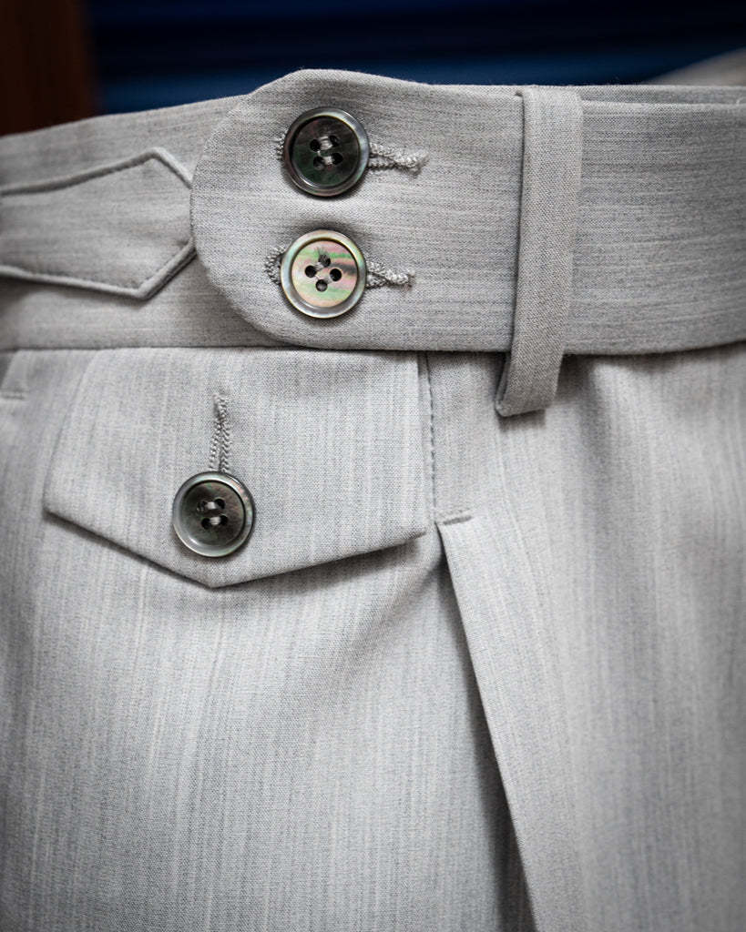 - Linguetta Frontale con Chiusura a Due Bottoni: La linguetta frontale con chiusura a due bottoni conferisce al pantalone un tocco di raffinatezza e praticità, assicurando una vestibilità sicura e confortevole.