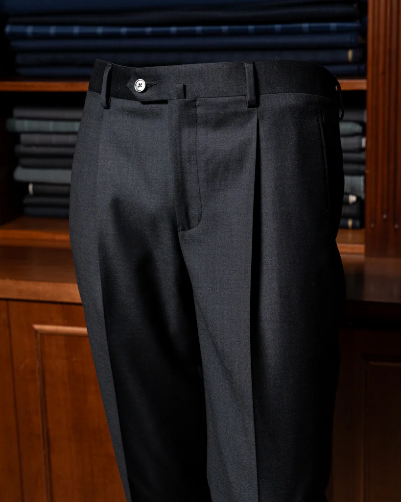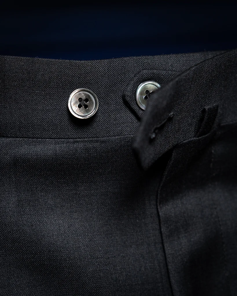 La particolarità di questo modello risiede nella configurazione delle tasche: le tasche laterali a filetto mantengono i fianchi piatti e puliti, evitando le aperture tipiche delle tasche all’americana. Sul retro, la raffinatezza continua con tasche a filetto impreziosite da bottoni superiori, un dettaglio di sicurezza e stile che richiama la tradizione della sartoria su misura.