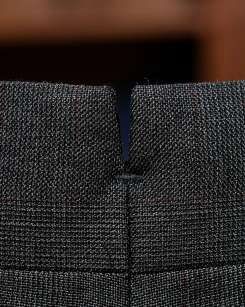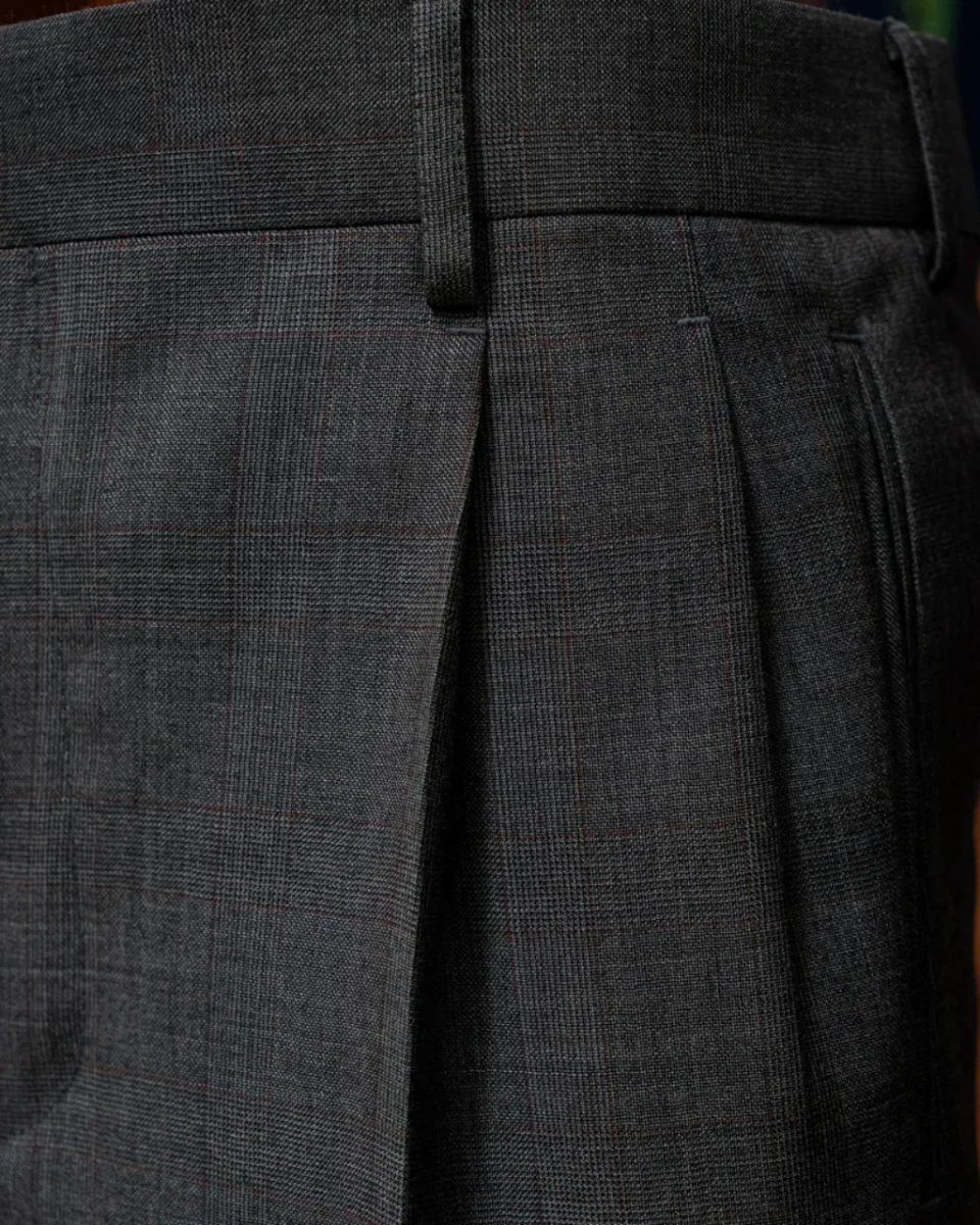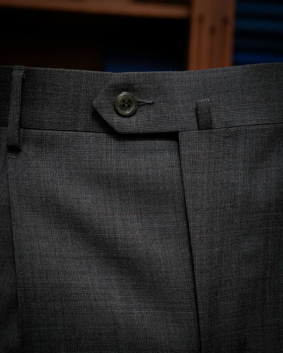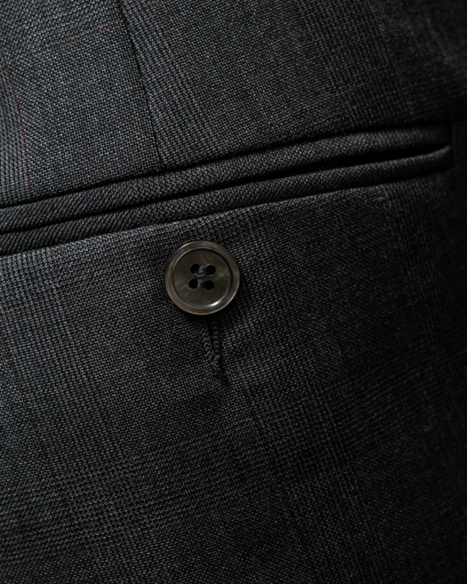 - Tessuto Grigio Cenere con Quadri Rossi: Realizzato con un tessuto grigio cenere decorato con quadri rossi, questo pantalone offre un aspetto sofisticato e moderno, ideale per l’ambiente business.