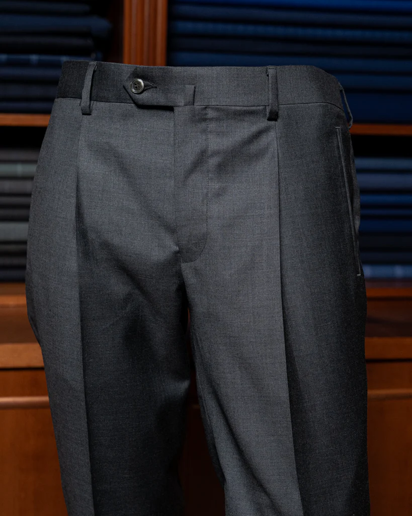 Realizzato in pura lana Super 120s, il tessuto offre una caduta fluida e una lucentezza discreta, tipica dei filati nobili. La struttura è definita da un approccio essenziale: il taglio è ad una pinces per mantenere la silhouette asciutta e moderna, mentre l’assenza di tirantini laterali sposta la funzionalità sui passanti classici, permettendo di completare l’outfit con una cintura in pelle coordinata.