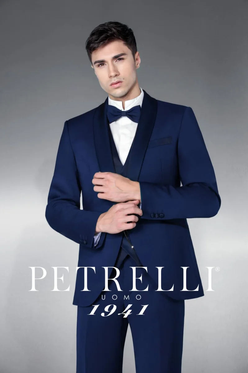 Un’eleganza da protagonista per lo sposo che desidera distinguersi: questo smoking blu, con collo sciallato in raso, interpreta l’eleganza più ricercata. Pensato per la cerimonia uomo, coniuga stile contemporaneo e tradizione sartoriale, diventando il punto di riferimento per chi cerca un abito capace di esaltare la figura con sobrietà.