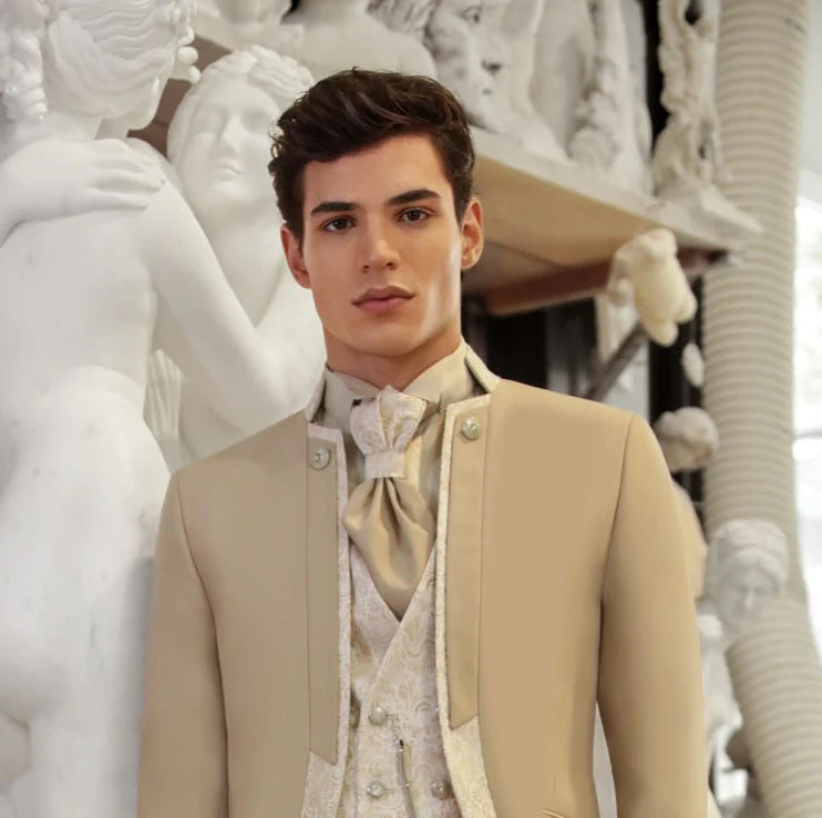 Eleganza luminosa e personalità decisa: questo capo esprime un’eccellenza esclusiva, ideale per chi cerca un abito capace di distinguersi. Il tessuto pregiato dona una mano setosa e una lucentezza misurata; la vestibilità slim valorizza la silhouette restando confortevole dall’altare al ricevimento. La giacca coreana con profili in raso e bottoni griffati sottolinea le linee pulite; il gilet doppiopetto e il plastron in raso coordinato completano un insieme di alta artigianalità. Il beige illumina l’incarnato e risulta estremamente fotogenico.