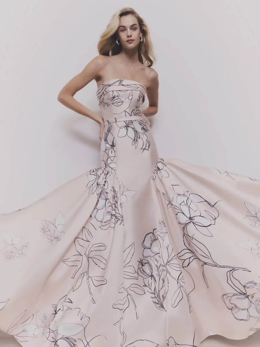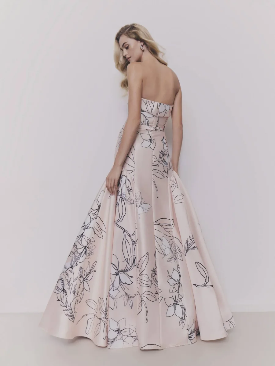 Realizzato in mikado di seta color cipria, questo modello lungo e sinuoso è impreziosito da una stampa grafica floreale stilizzata che dona leggerezza e movimento all’intera figura.