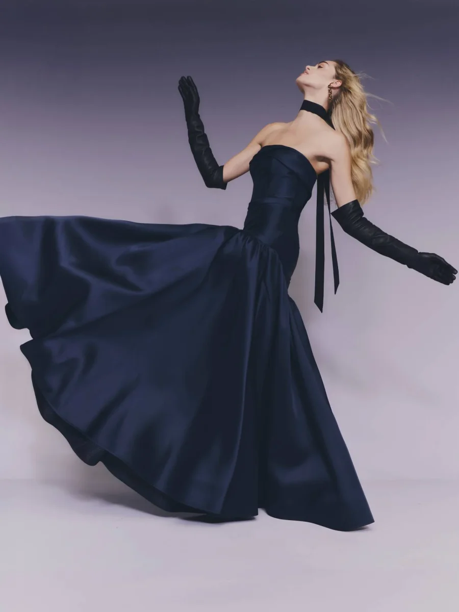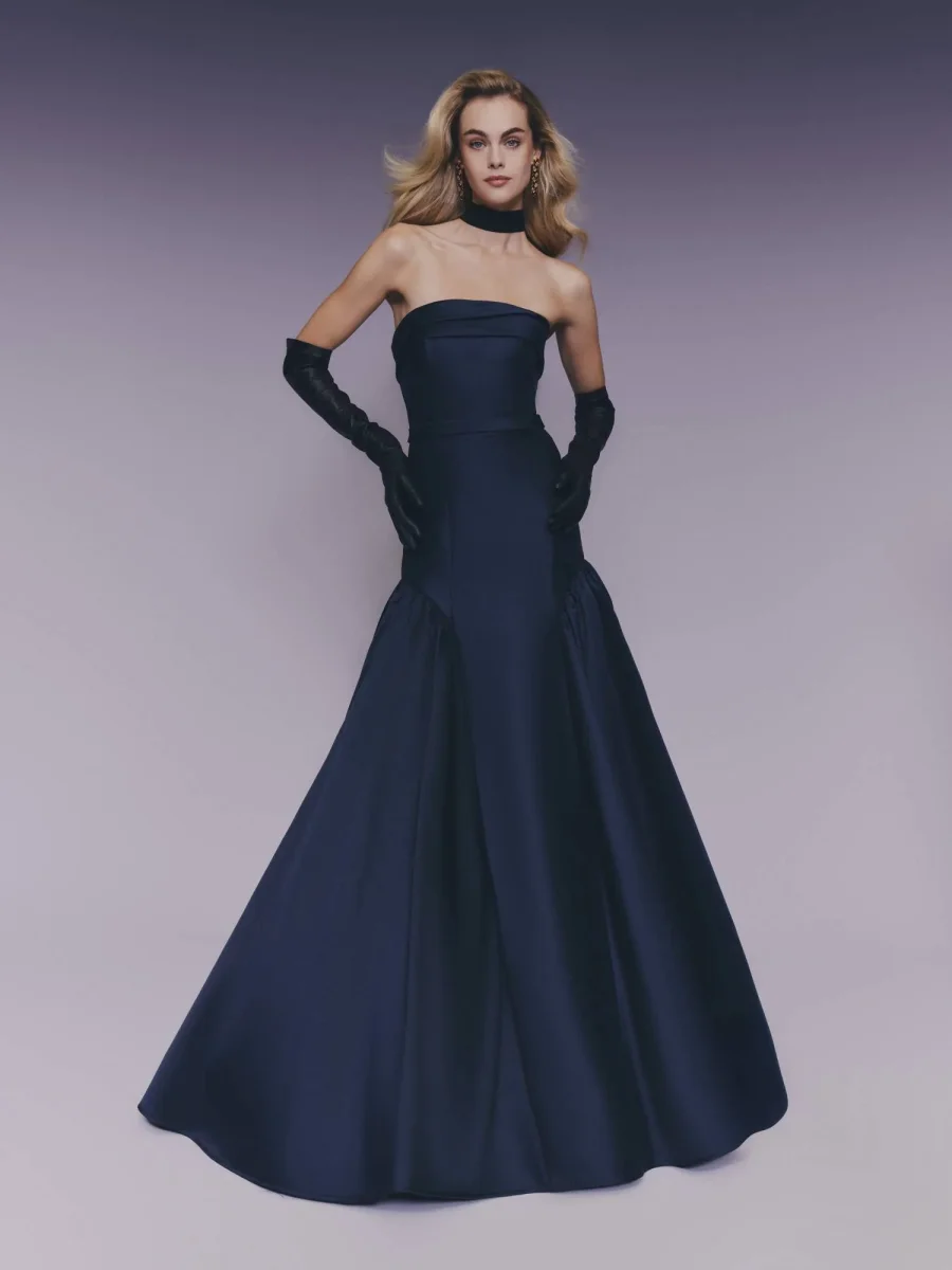 Il corpino bustier senza spalline, dalla linea pulita e strutturata, valorizza il décolleté con eleganza, mentre la gonna ampia e fluida si apre in un meraviglioso gioco di pieghe, creando un effetto scenografico di grande impatto.